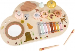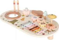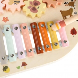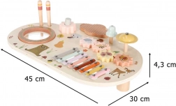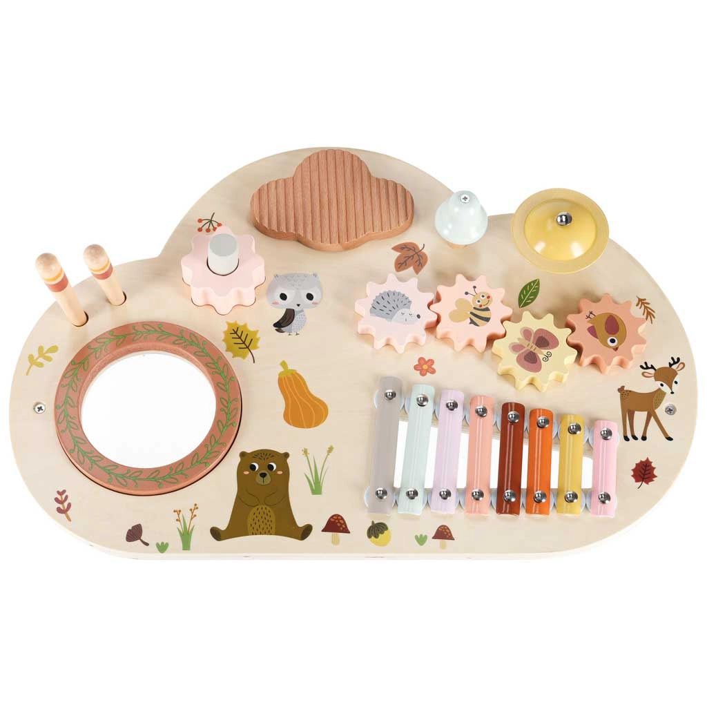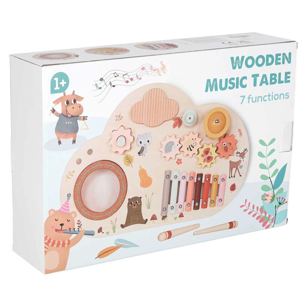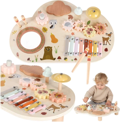 Odkryj świat rytmu i kreatywności z tym drewnianym muzycznym stolikiem dla najmłodszych. Łączy ksylofon, bębenek, dzwonek oraz inne elementy sensoryczne dla zabawy, nauki i rozwoju motoryki. Dzięki stabilnym nóżkom, wysokiej jakości drewnu i pastelowej stylistyce to idealny wybór na pierwsze muzyczne odkrycia.