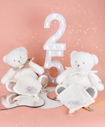 Ten mięciutki miś z przytulnym kocykiem-przytulanką ucieszy niemowlęta i rodziców. Kocyk zdobi subtelny haft marki DOUDOU oraz satynowe wstążki z czułymi wiadomościami, które dodają rytuałowi przed snem delikatności. Dzięki możliwości schowania kocyka w brzuszku misia zestaw świetnie sprawdzi się w podróży i łatwo utrzymać go w czystości.
