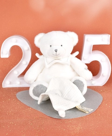 Uroczy zestaw prezentowy DOUDOU z pluszowym misiem i mięciutkim kocykiem daje dzieciom od urodzenia poczucie bezpieczeństwa i spokojnego zasypiania. Miękki, premium materiał, delikatne, neutralne kolory oraz praktyczna możliwość schowania kocyka do brzuszka misia sprawiają, że to idealny prezent na narodziny lub chrzest. W zestawie eleganckie pudełko prezentowe.