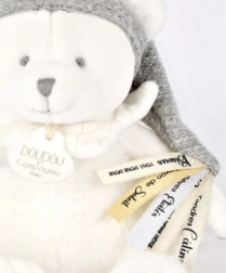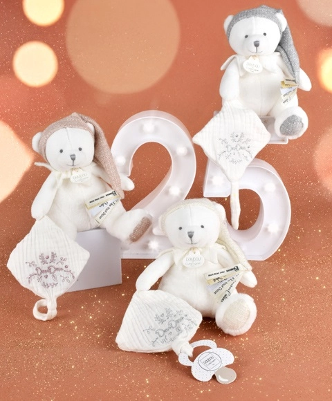 Ten elegancki zestaw upominkowy łączy komfort i funkcjonalność w jednym. Miękki miś z czapeczką i kołnierzykiem ma do łapki przyszyty miękki kocyk, który uspokaja i wspiera łatwiejsze zasypianie. Na końcu kocyka znajduje się praktyczny uchwyt na smoczek, dzięki któremu smoczek pozostaje zawsze czysty i łatwo dostępny.