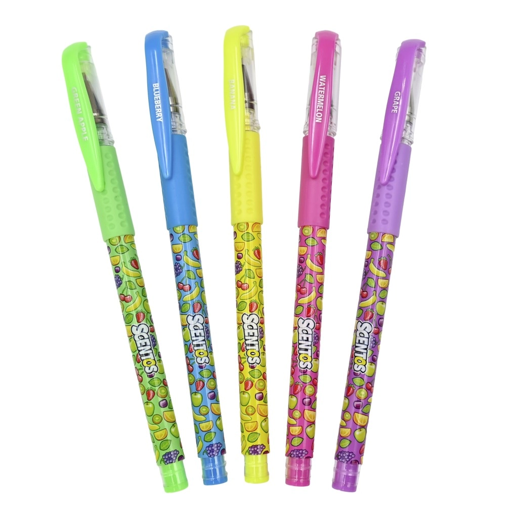 W opakowaniu znajdziesz pięć zapachów i kolorów: zielony (green apple), niebieski (blueberry), żółty (banana), różowy (watermelon) i fioletowy (grape). Długopisy wykonane są z nietoksycznych materiałów i spełniają wymagania dotyczące bezpiecznych artykułów szkolnych.