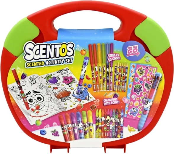 Odkryj praktyczny pachnący kreatywny zestaw Scentos w solidnym przenośnym kuferku, który ucieszy małych twórców. Zawiera pachnące flamastry, kredki ołówkowe, kredki woskowe, kolorowanki i naklejki. Wszystko jest nietoksyczne i bezpieczne dla dzieci, idealne do domu, do szkoły i w podróż.