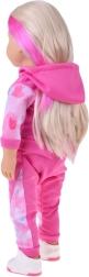 Artukulowane ręce i nogi pozwalają lalce stać, siedzieć i pozować, dlatego jest idealna do fotografowania i codziennej zabawy. Zestaw obejmuje bluzę z kapturem oraz spodnie jogger w pastelowym tie‑dye, które uzupełniają wygodne tenisówki. Ubranka są łatwe do zdejmowania, aby dzieci mogły cieszyć się przebieraniem i rozwijać małą motorykę.