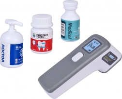 Stetoskop z odgłosami serca, elektroniczny termometr, strzykawka, nożyczki, pincety, otoskop, „leki” w buteleczkach i pudełeczkach – wszystko do kompletnego gabinetu.