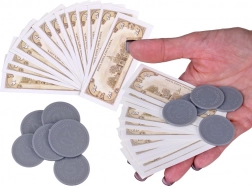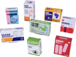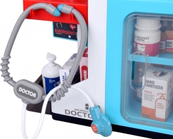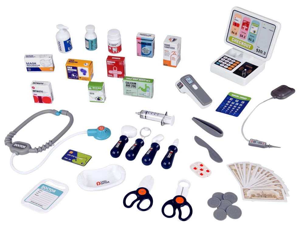 W zestawie znajduje się kasa z terminalem (płatność kartą i „gotówką”), stetoskop z dźwiękiem bicia serca, elektroniczny termometr oraz szereg narzędzi lekarskich i pudełeczek z „lekami”. Zestaw rozwija komunikację, motorykę małą oraz podstawową wiedzę finansową.