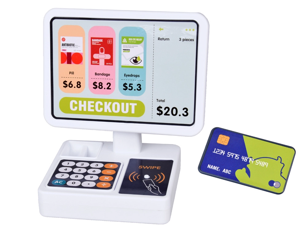 Dzieci poćwiczą płatność kartą i gotówką. Ekran, przyciski i czytnik kart uzupełnione dźwiękami nadają zabawie realistyczny charakter i walor edukacyjny.