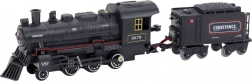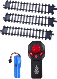 - Lokomotywa z parą i światłem, wagony, zdalny pilot 2,4 GHz, zestaw torów (181 × 78 cm), buteleczka na wodę, akumulator 3,7 V 900 mAh, kabel do ładowania USB