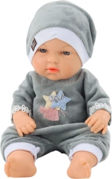 - laleczka niemowlę w szarych piżamkach i czapeczce