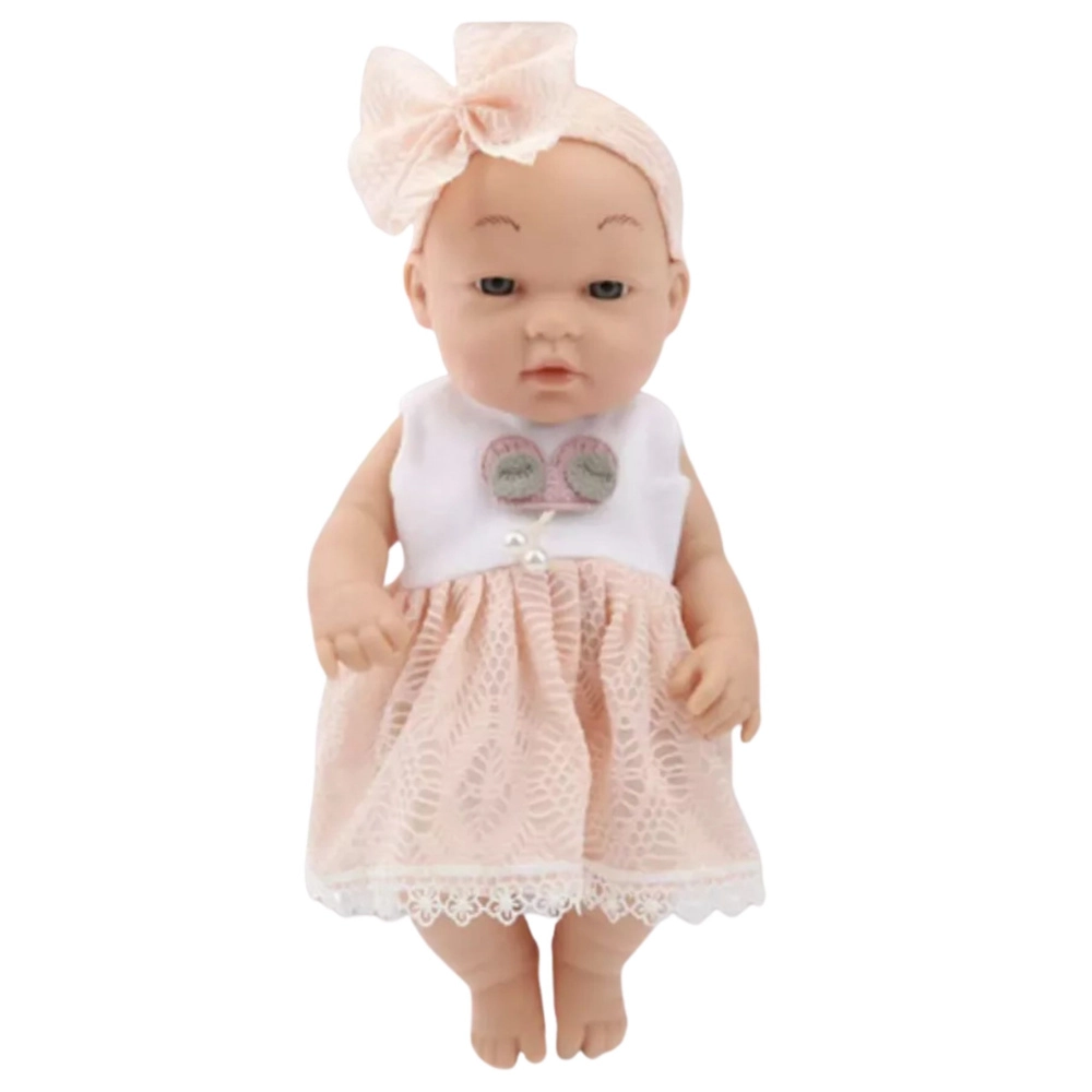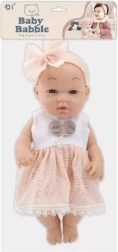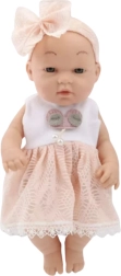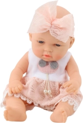 Ta lalka–niemowlę zachwyca elegancką różową sukienką z koronkowym wykończeniem i dopasowaną opaską z dużą kokardą. Delikatne rysy twarzy i przyjemne materiały tworzą wrażenie prawdziwego niemowlęcia, które dzieci szybko pokochają.