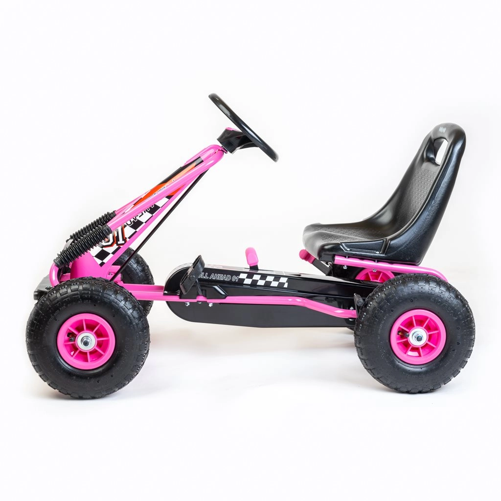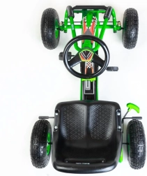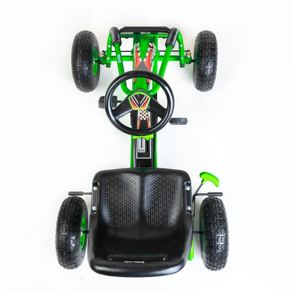 Gokart wyposażono w napęd łańcuchowy z możliwością wyłączenia napędu (wolny bieg) oraz bieg wsteczny, dzięki czemu łatwo manewruje się nawet na małej przestrzeni. Hamulec ręczny na oba tylne koła zwiększa bezpieczeństwo i kontrolę, a wytrzymała metalowa rama i sportowe plastikowe osłony sprostają codziennej zabawie.