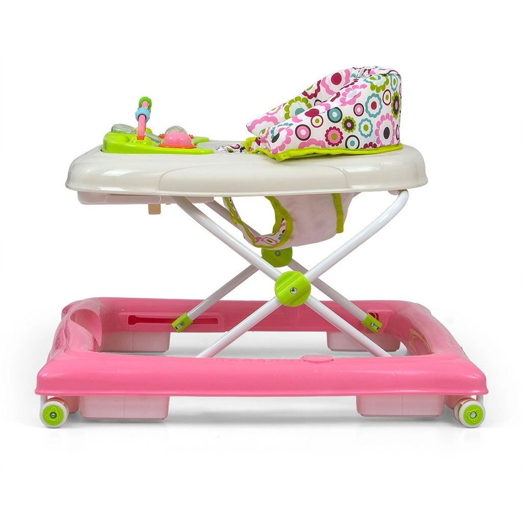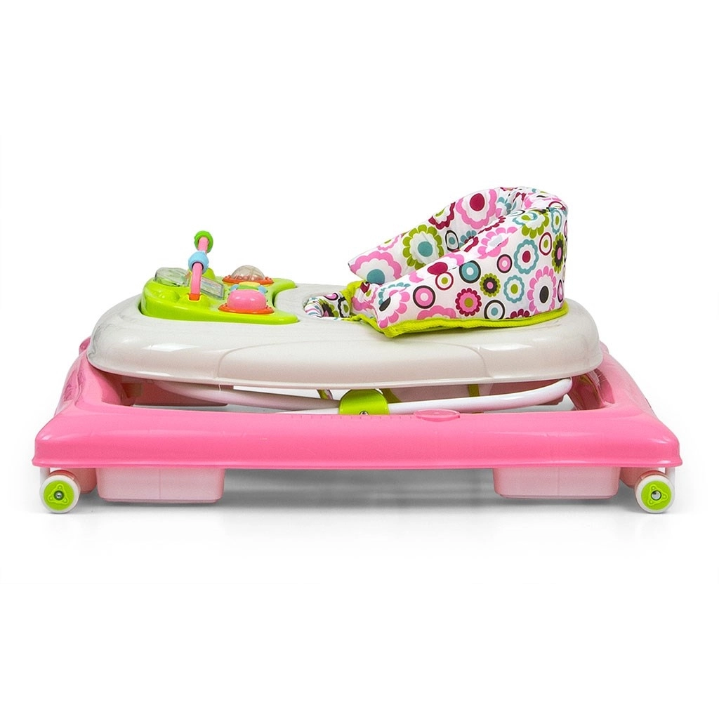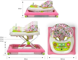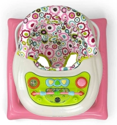 Interaktywny panel dźwiękowy ze światełkami, melodiami, piszczałką, grzechotką i przyciskami rozwija zmysły oraz motorykę. Panel można łatwo zdjąć i używać oddzielnie jako zabawki w podróży, a tacka posłuży jako stolik do zabawy lub przekąsek. Cztery wysokiej jakości obrotowe kółka zapewniają płynny ruch, a osiem gumowych stopek zabezpieczających chroni przed zjazdem ze schodów.
