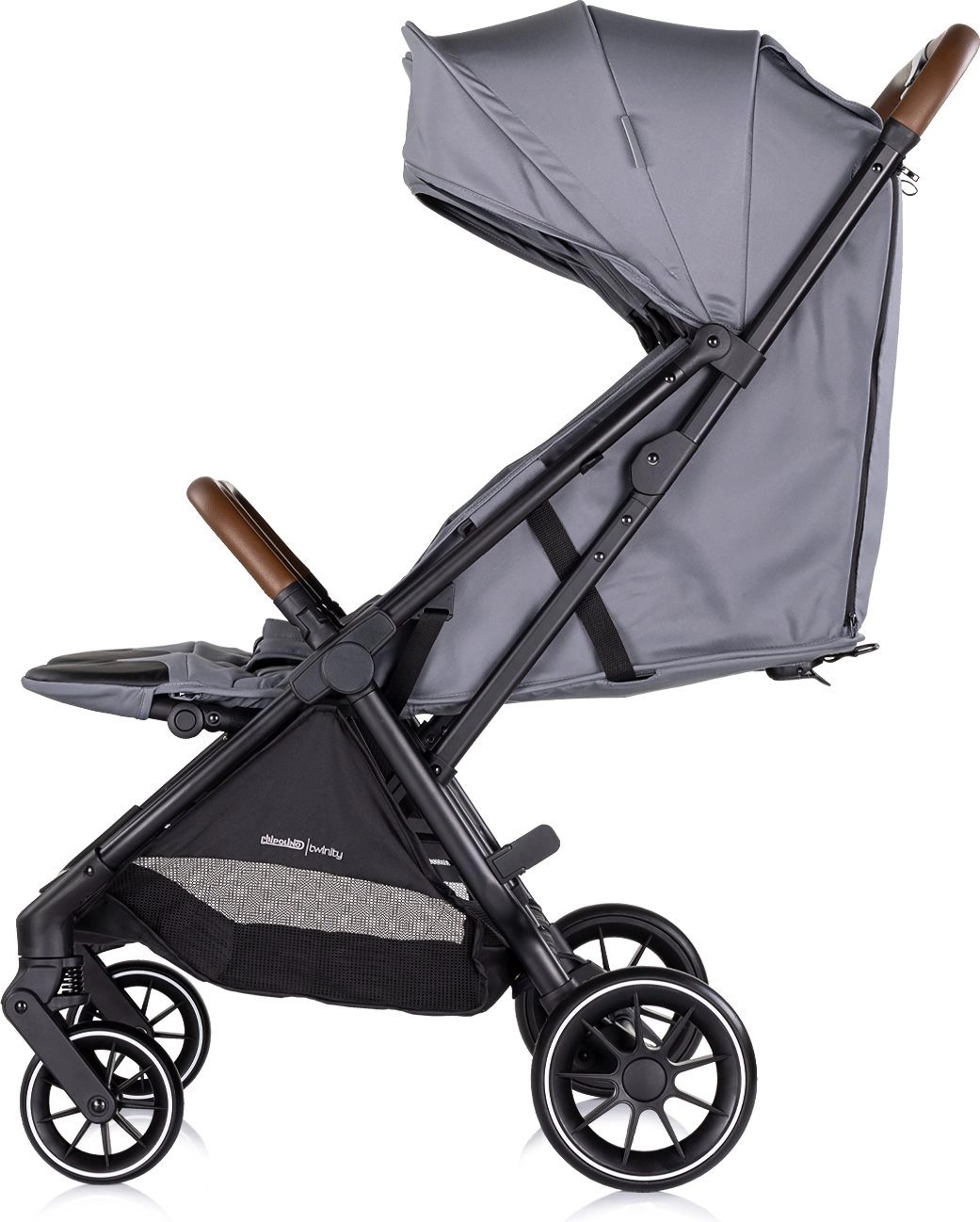 Duże budki z okienkiem podglądowym, siateczkową wentylacją i wodoodporną tkaniną chronią przed słońcem i wiatrem. Bezpieczeństwo zapewniają 5‑punktowe pasy z miękkim podbiciem oraz odpinana barierka z ekoskóry. Amortyzowane, łatwo demontowane koła i hamulec na tylnej osi gwarantują płynną i pewną jazdę.