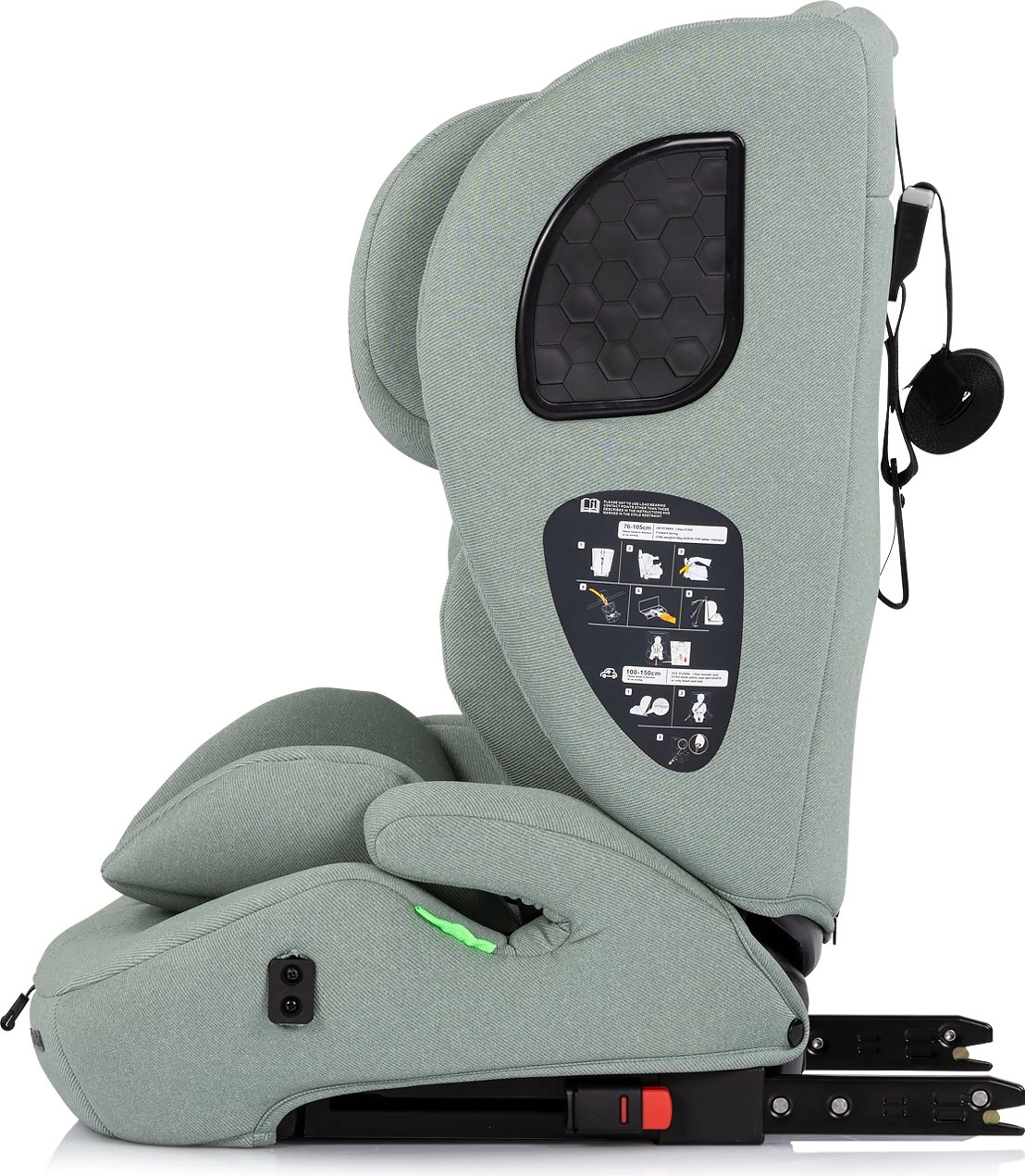 Szybkie i stabilne mocowanie. Dla wzrostu 76–105 cm montaż ISOFIX + Top Tether; dla 100–150 cm użycie 3‑punktowego pasa samochodowego z możliwością połączenia z ISOFIX.