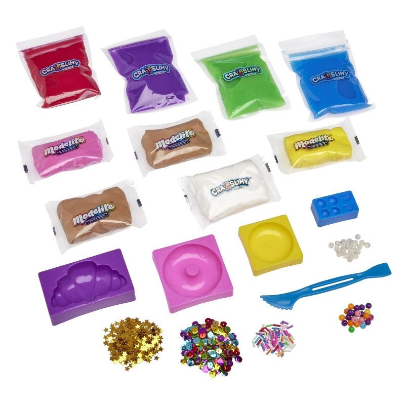 Twórz urocze deserowe dzieła bez okruszków i bałaganu. Zestaw Cra-Z-Slimy Cukiernicze szaleństwo zawiera slime’y o różnych konsystencjach, lekką, puszystą masę plastyczną oraz bogate zdobienia (brokat, konfetti, koraliki). Dzięki praktycznym foremkom w kształcie deserów modelowanie jest łatwe i przyjemne nawet dla początkujących.