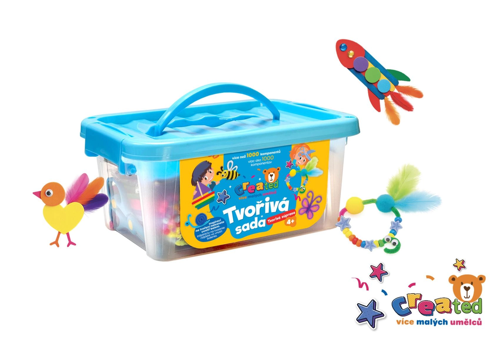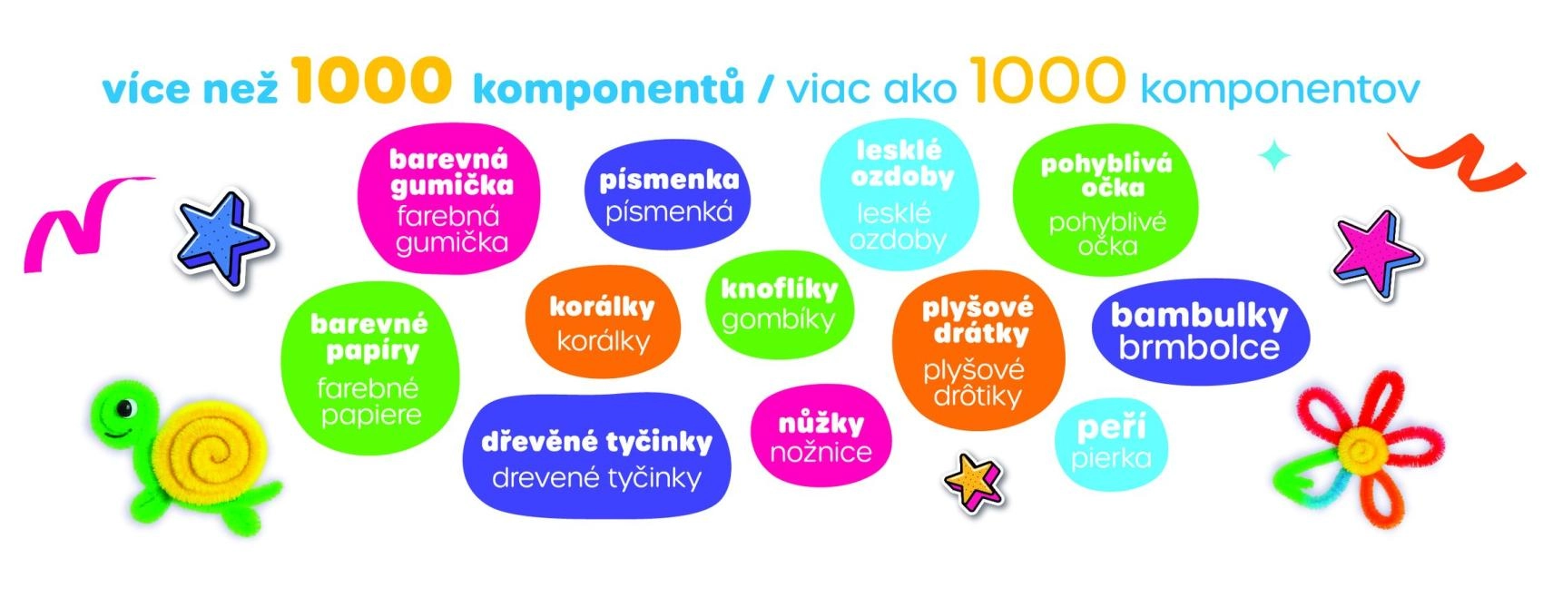 Ten bogaty zestaw rozwija dziecięcą wyobraźnię, motorykę małą i kreatywność. Dzięki różnorodnym materiałom dzieci wykonają własne ozdoby, zwierzątka, kwiaty i drobne dekoracje – w domu, w przedszkolu i w podróży. Praktyczne pudełko utrzymuje wszystkie elementy razem i przyspiesza sprzątanie.