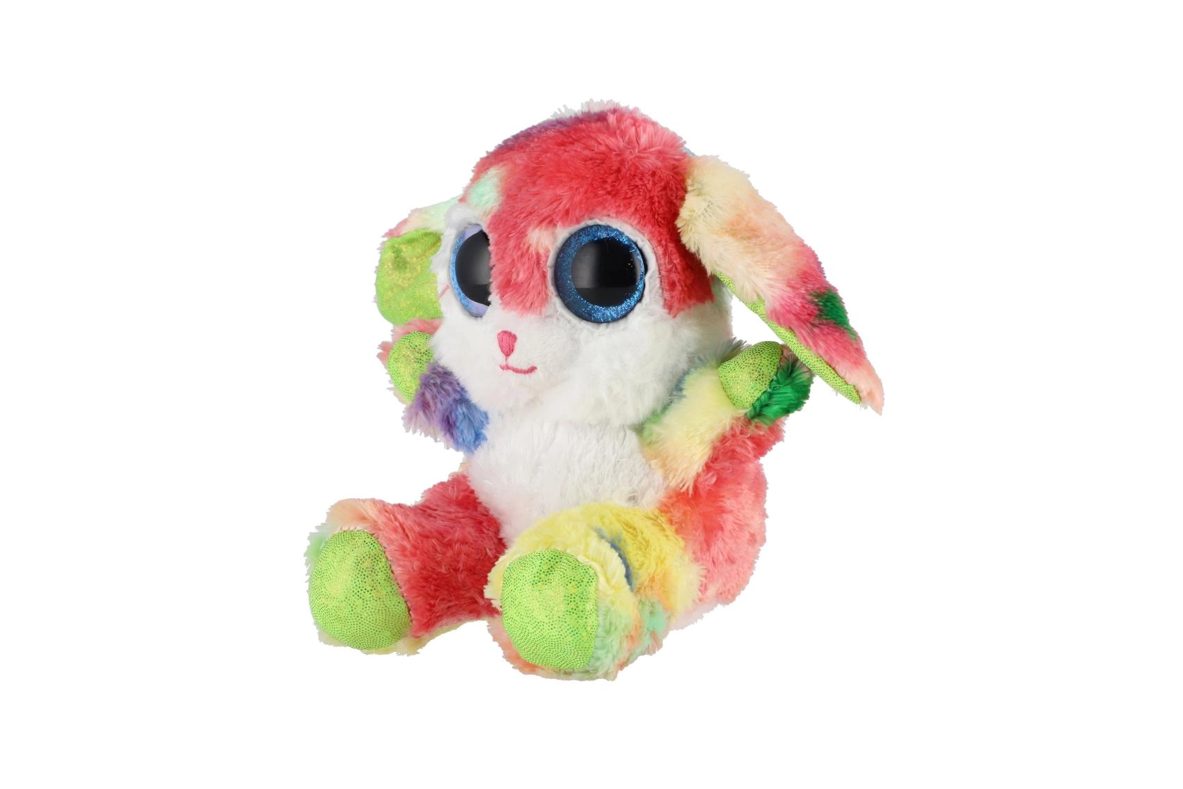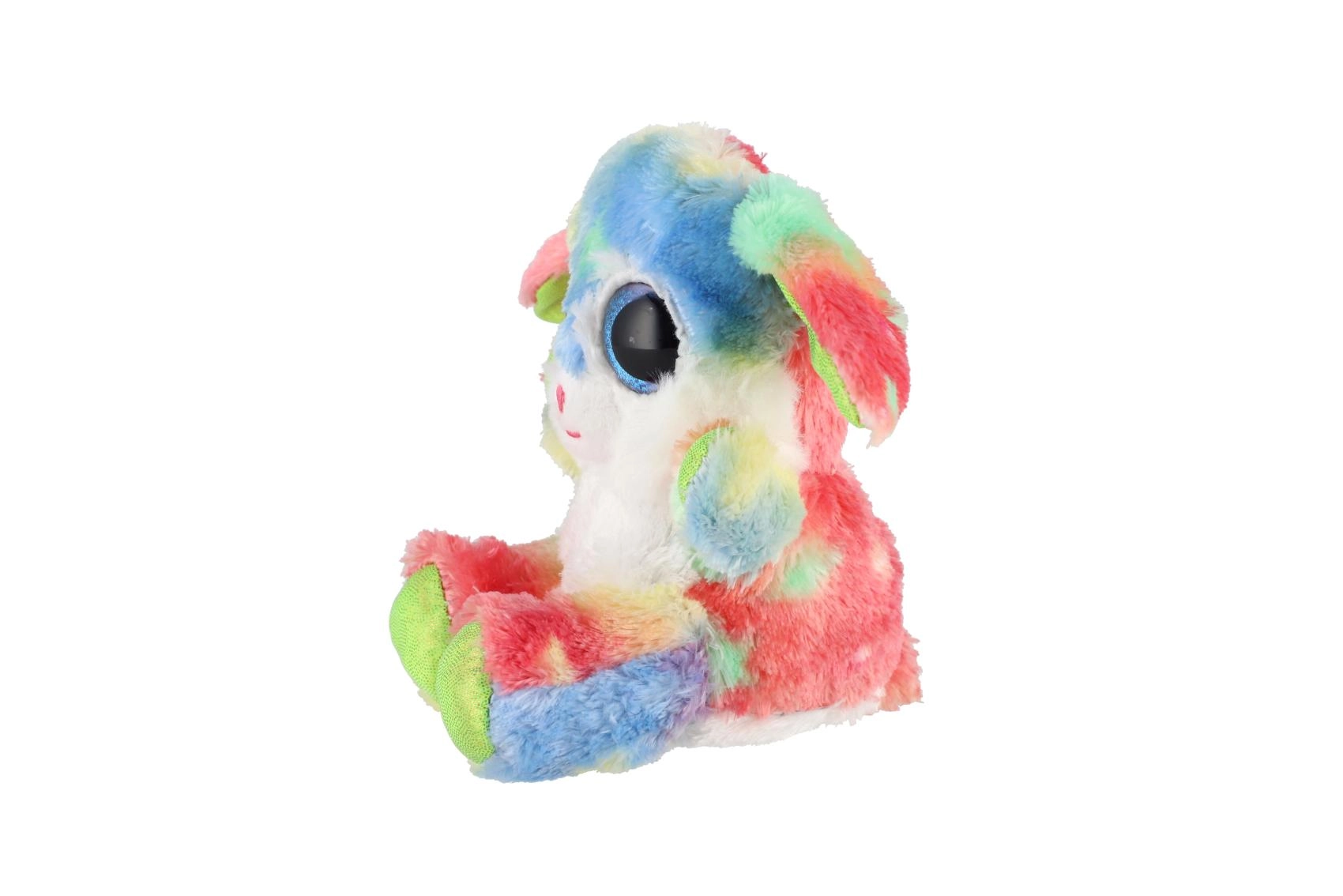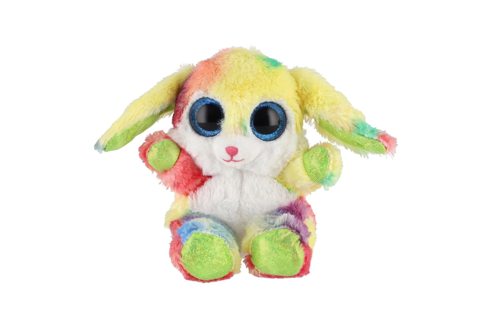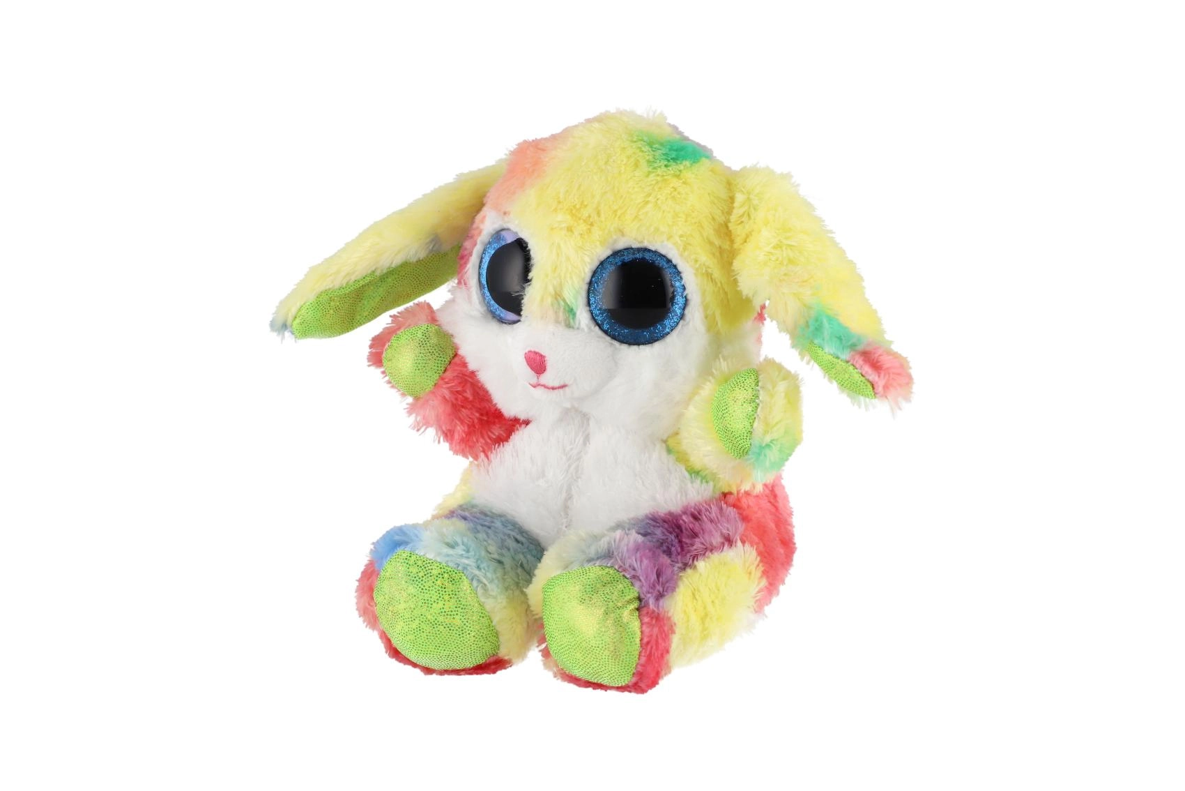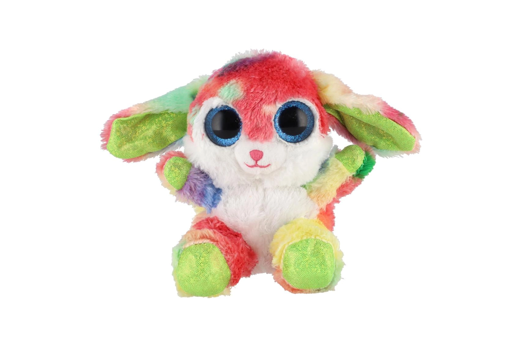 Uroczy siedzący króliczek w tęczowych kolorach z dużymi, błyszczącymi oczami to idealna przytulanka dla dzieci. Wykonany z ekstra miękkiego pluszu, ma długie elastyczne uszka i kompaktowy rozmiar 15 cm, dzięki czemu łatwo zabrać go do łóżeczka, plecaka czy w podróż.