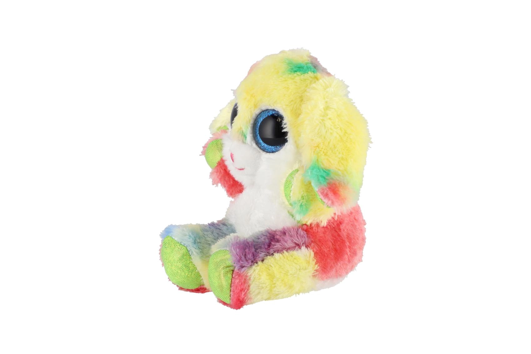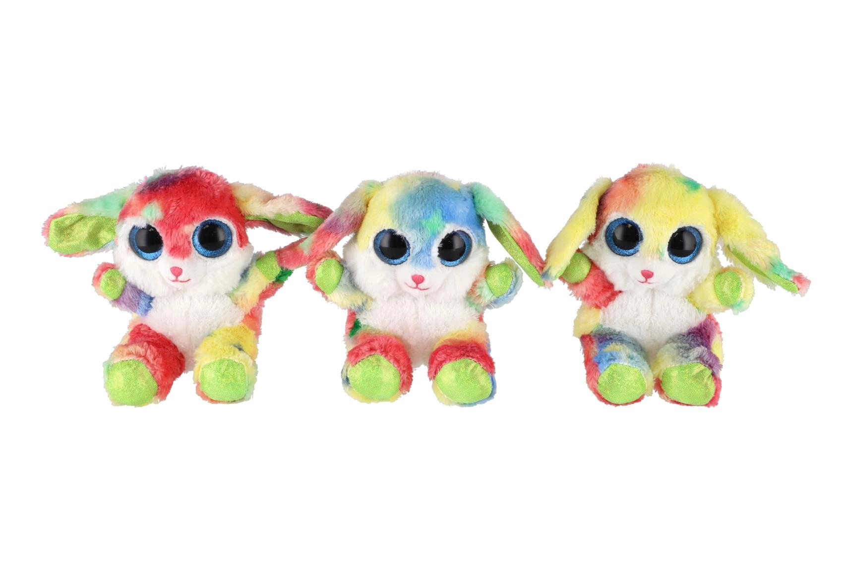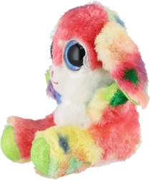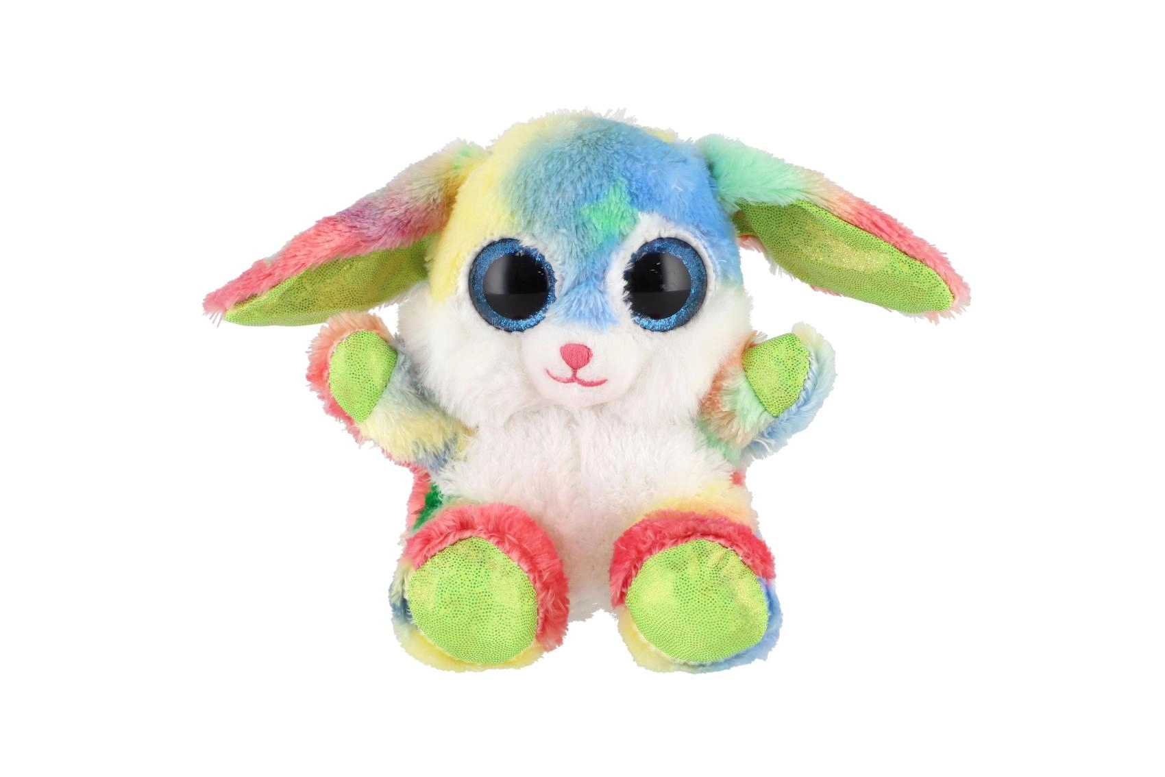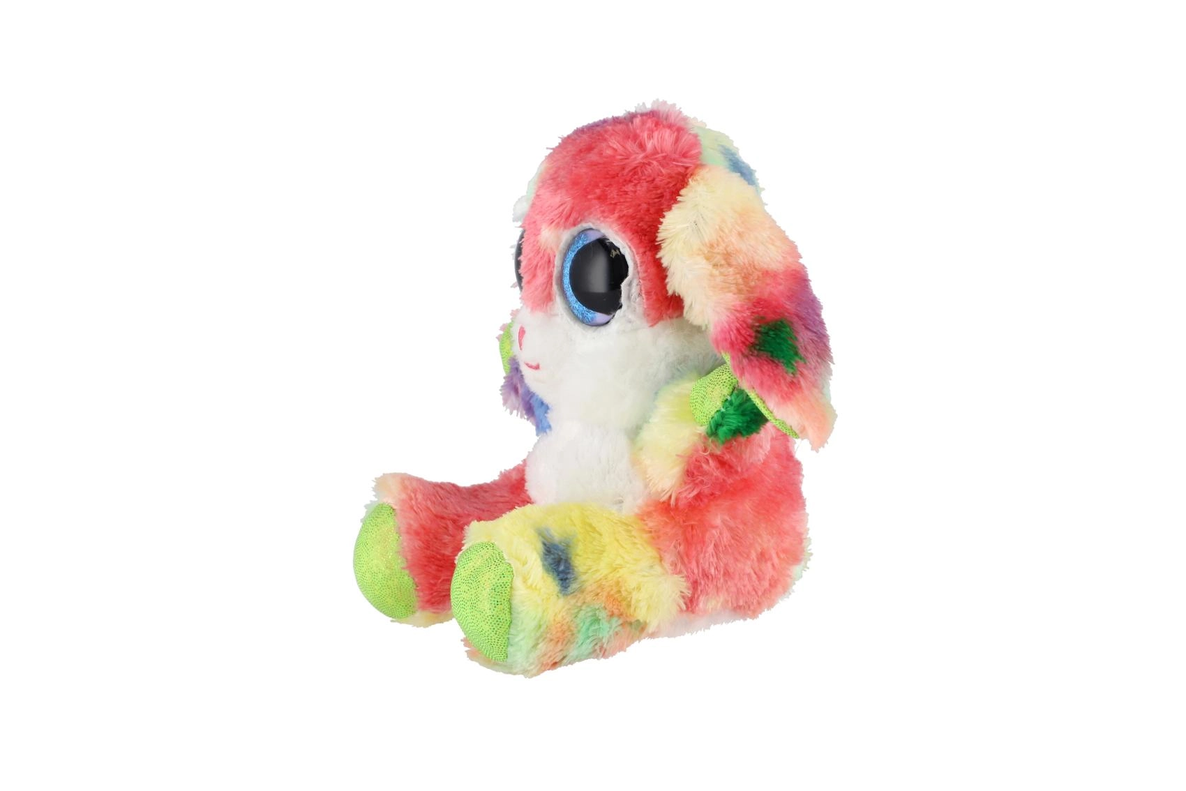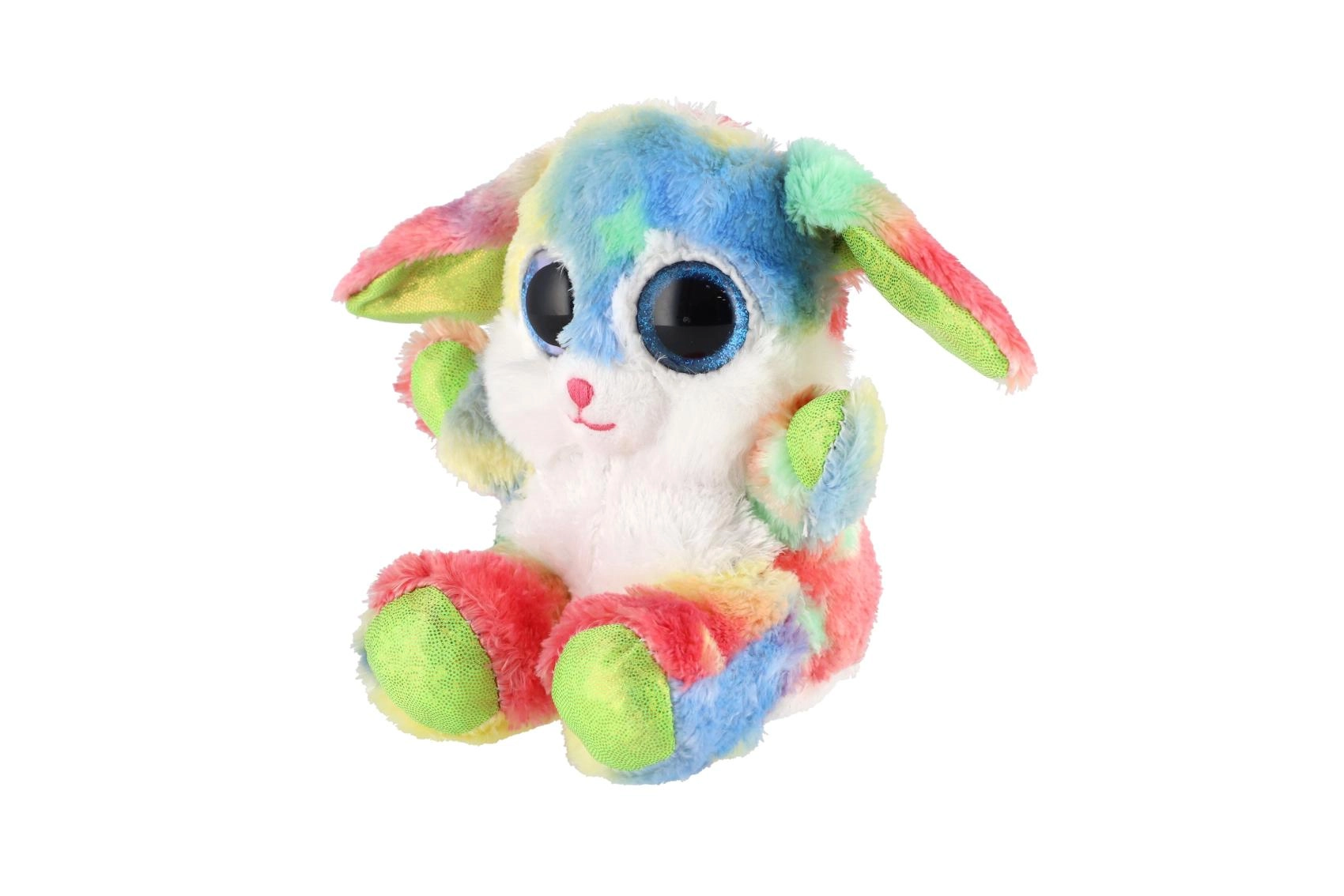 Uroczy siedzący króliczek w tęczowych kolorach z dużymi, błyszczącymi oczami to idealna przytulanka dla dzieci. Wykonany z ekstra miękkiego pluszu, ma długie elastyczne uszka i kompaktowy rozmiar 15 cm, dzięki czemu łatwo zabrać go do łóżeczka, plecaka czy w podróż.