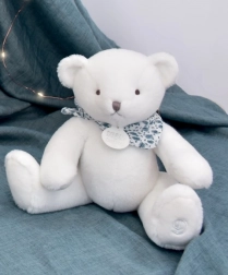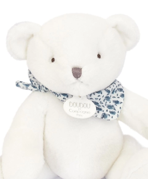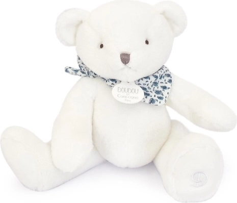 Uroczy biały pluszowy miś z niebieską chustką marki DOUDOU to idealny pierwszy przyjaciel dla niemowląt. Wykonany z mięciutkiego, premium materiału, ma bezpiecznie haftowane detale i jest odpowiedni od urodzenia. Doskonale sprawdza się do wyciszenia, przytulania i spokojnego zasypiania, a dzięki stonowanym kolorom pasuje do każdej dziecięcej wyprawki.