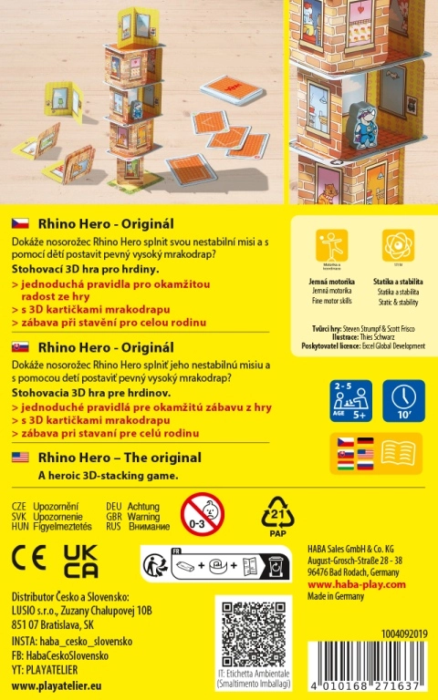 Zabawna i emocjonująca gra rodzinna, w której budujecie wysoki kartonowy drapacz chmur i pomagacie superbohaterowi Rhino Hero wspinać się w górę. Idealna na szybkie rozgrywki dla 2–5 graczy trwające około 10 minut. Wspiera zręczność, współpracę rodzeństwa i przynosi mnóstwo śmiechu zarówno dzieciom, jak i dorosłym.