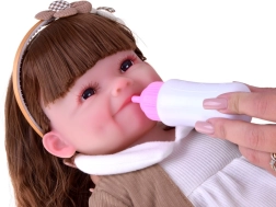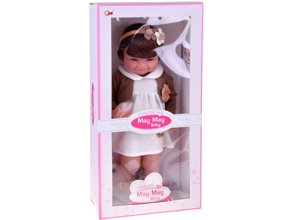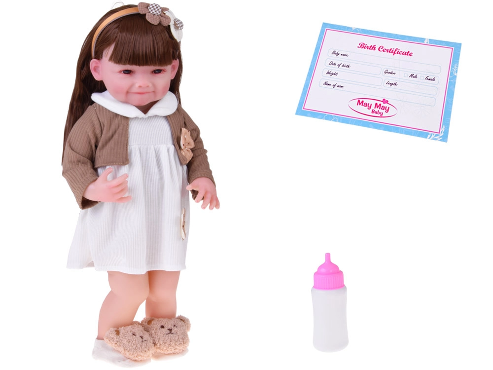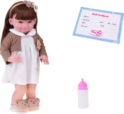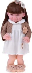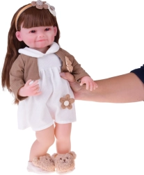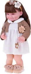 Ta piękna lalka ma na sobie białą sukienkę z kwiatową aplikacją oraz brązowy sweterek z kokardką. Strój uzupełniają miękkie kapcie w kształcie misiów oraz beżowa opaska z ozdobą, które podkreślają delikatny, dziecięco słodki wygląd. Dzięki realistycznej buzi i długim włosom dzieci spędzą godziny na kreatywnej zabawie.