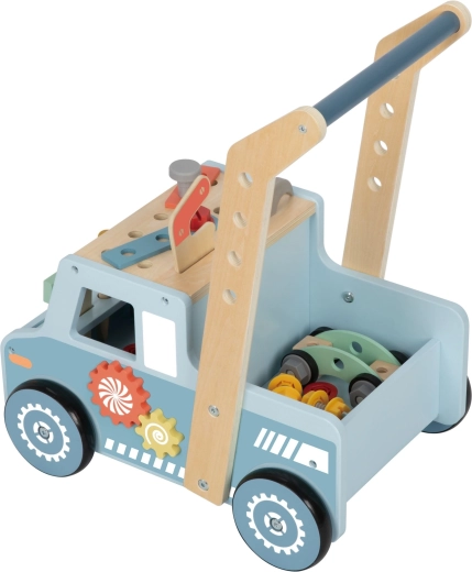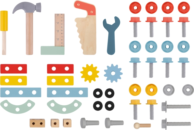 Dzięki gumowym paskom na kołach jazda jest cicha i przyjazna dla podłogi. Ergonomiczny uchwyt dobrze leży w dziecięcej dłoni, a tylny schowek na narzędzia mieści wszystkie elementy. W zestawie znajduje się bogaty komplet drewnianych narzędzi i łączników do nieskończonych wariantów konstrukcji.