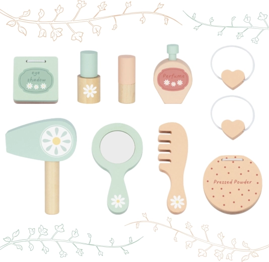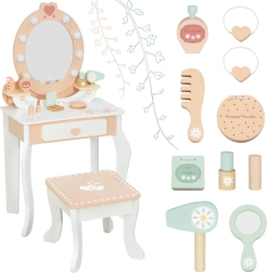 W zestawie znajduje się szeroka paleta drewnianych dodatków – od „kosmetyków” po grzebień czy suszarkę – które nie są prawdziwymi kosmetykami, dlatego są odpowiednie i bezpieczne do zabawy. Toaletka wspiera małą motorykę, samodzielność, logiczne myślenie oraz wyobraźnię.