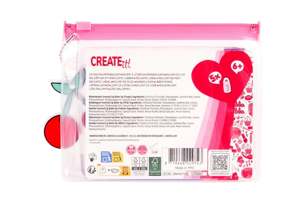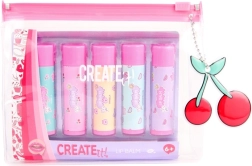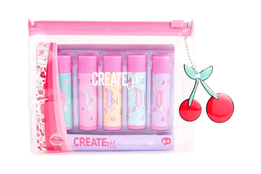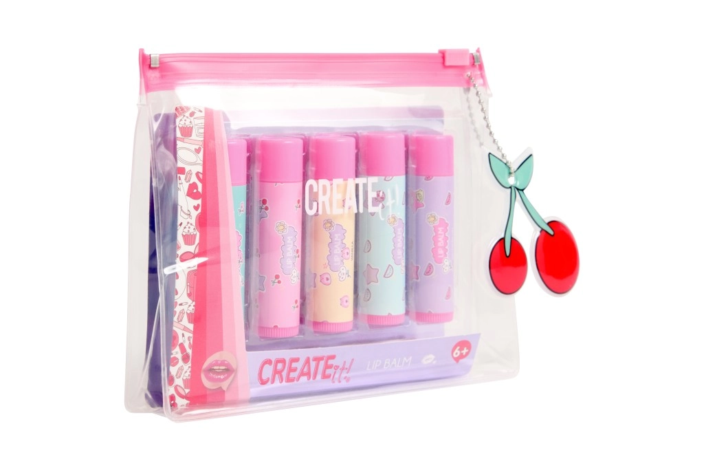 Zestaw CREATE IT! to pięć radosnych balsamów do ust w pastelowych odcieniach, które pielęgnują usta przez cały dzień. Dzięki praktycznemu przezroczystemu etui z różowym suwakiem masz wszystkie balsamy ładnie razem – w domu, w szkole i w podróży.