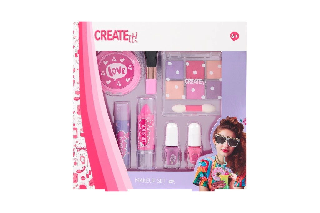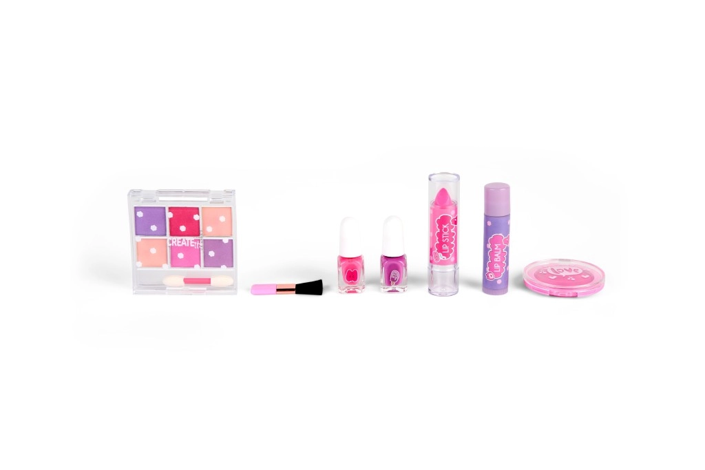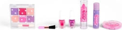 2× lakier do paznokci, kreda do włosów, duży pędzel, balsam do ust, pomadka, mały dwustronny aplikator, paletka 6 połyskujących cieni do powiek