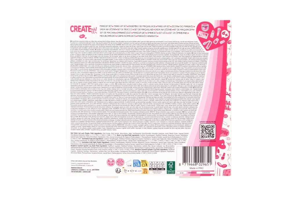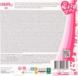 Odkryj radosną i bezpieczną zabawę ze stylowym dziecięcym zestawem do makijażu CREATE IT! Pink Turquoise. Ten kolorowy kosmetyczny set dla małych elegantek od 6 lat zawiera wszystko, czego potrzeba do kreatywnego makijażu i stylizacji paznokci: 6 połyskujących cieni do powiek, 2 lakiery do paznokci, kredę do włosów, balsam do ust, pomadkę, duży pędzel oraz mały, dwustronny aplikator.