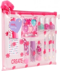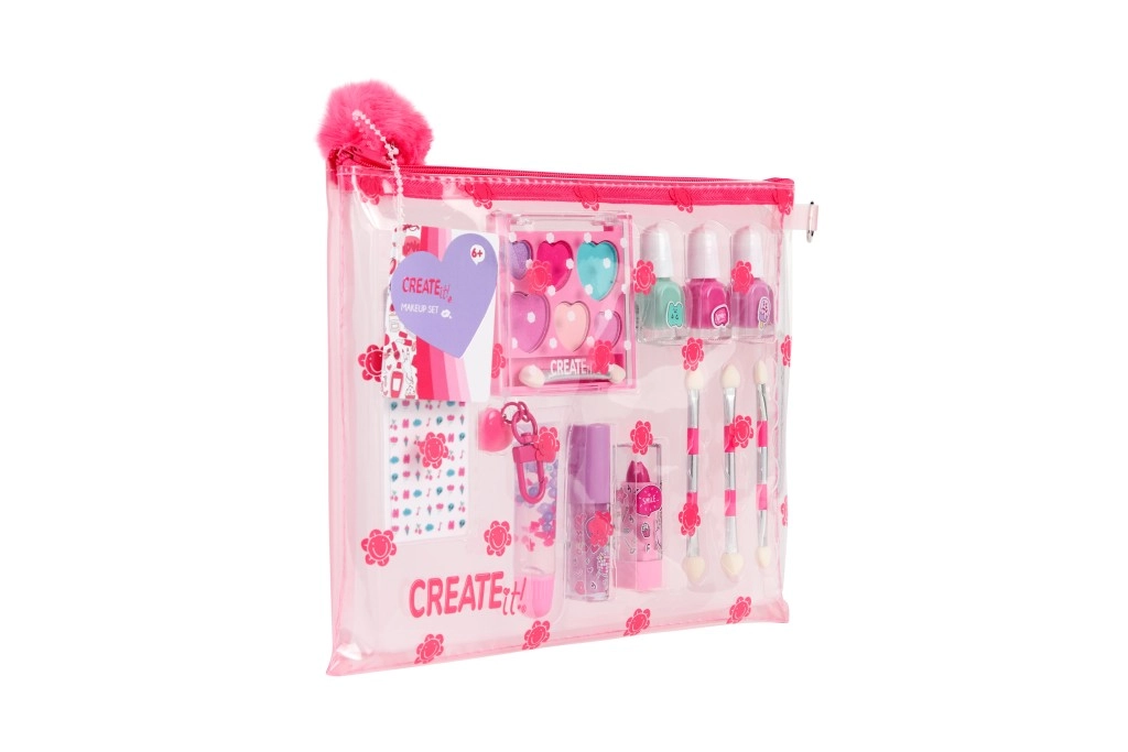Uroczy dziecięcy zestaw do makijażu w przezroczystej torebeczce jest idealny dla małych elegantek. Zawiera wszystko, co potrzebne do zabawnego makijażu i zdobienia paznokci: 3 lakiery do paznokci, błyszczyk do ust, balsam do ust, 3 aplikatory oraz naklejki na paznokcie. Praktyczna torebeczka z pom‑pomem zdobi, a jednocześnie utrzymuje wszystkie akcesoria kosmetyczne ładnie w jednym miejscu.