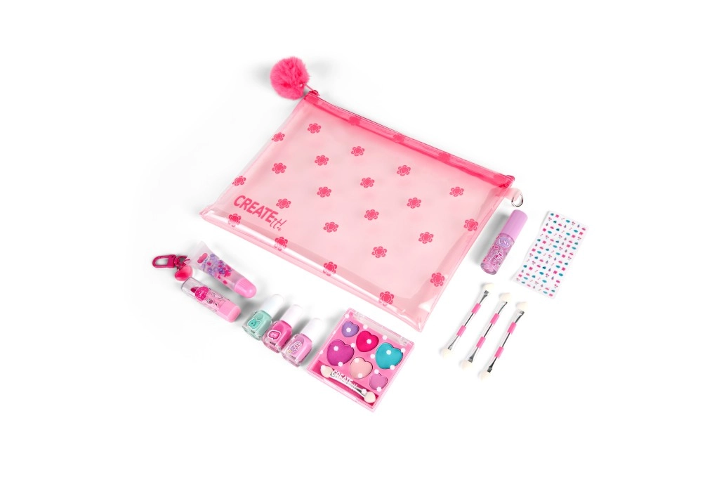 Ten radosny zestaw do makijażu dla dzieci w różowej, przezroczystej torebeczce z kwiatowym nadrukiem oferuje bezpieczny i zabawny sposób na odkrywanie świata makijażu. Dzięki przejrzystemu ułożeniu każdy element ma swoje miejsce, a dzieci mogą łatwo zabrać kosmetyki ze sobą.