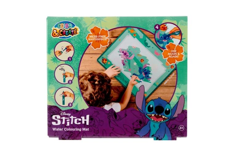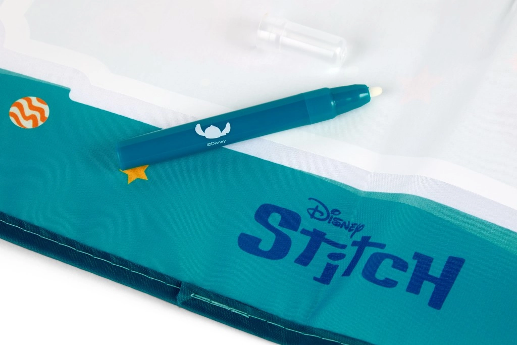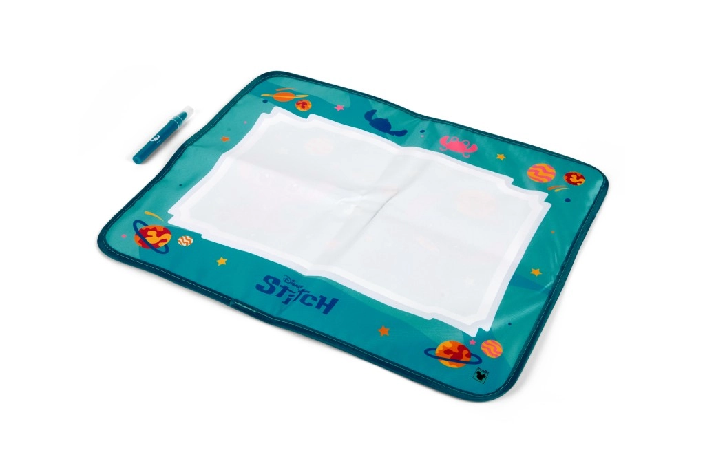 Zabawna i wielokrotnego użytku mata wodna z uwielbianą postacią STITCH ucieszy każdego małego artystę. Wystarczy napełnić specjalny pisak wodą i malować – kolory pojawiają się bez bałaganu, a po wyschnięciu obrazki znikają, więc można tworzyć wciąż na nowo. Idealna do domu i w podróży.