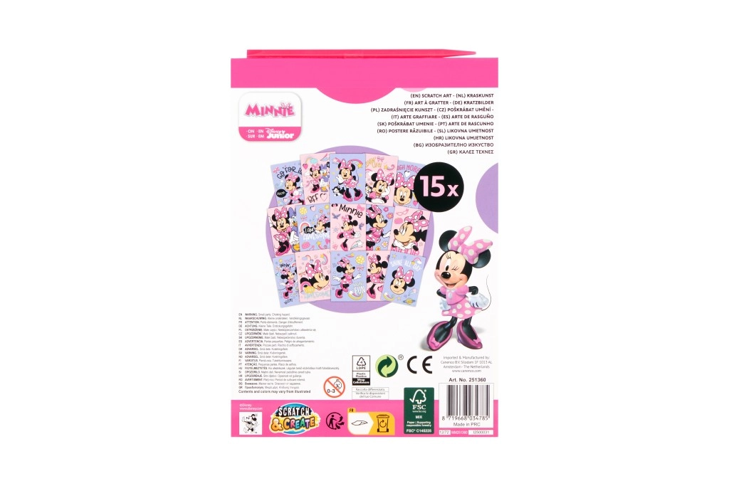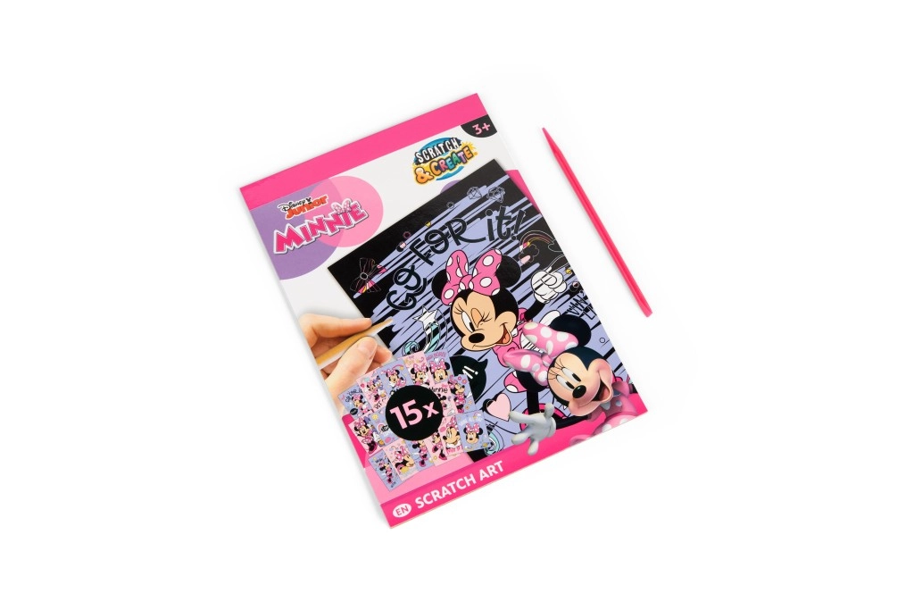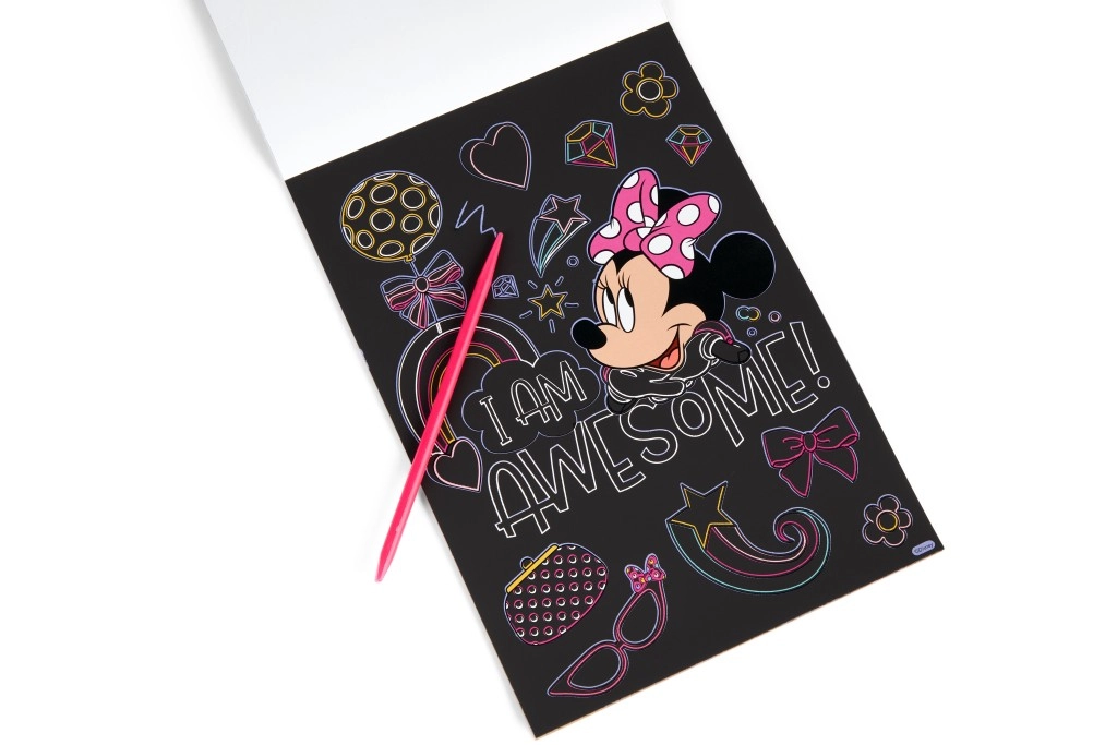 Pod czarną warstwą kryją się żywe kolory i motywy MINNIE, które dzieci odsłaniają rysikiem – prosta, zabawna i wciągająca twórczość.