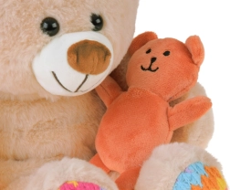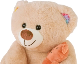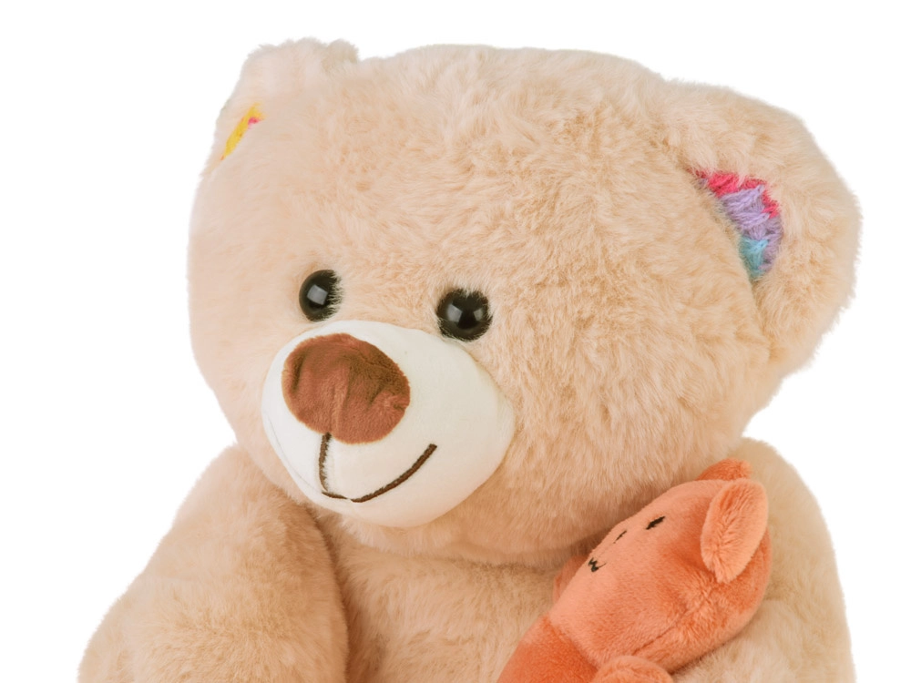 Beżowy pluszowy miś z wyszywanym uśmiechem trzyma małego pomarańczowego misia – uroczy duet, który dzieci pokochają od razu.