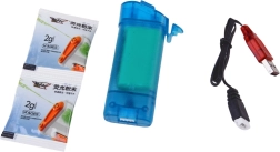 W zestawie akumulator 7,4 V 500 mAh, ładowarka USB oraz dwie saszetki do przygotowania fluorescencyjnej wody do efektownych nocnych strzałów.