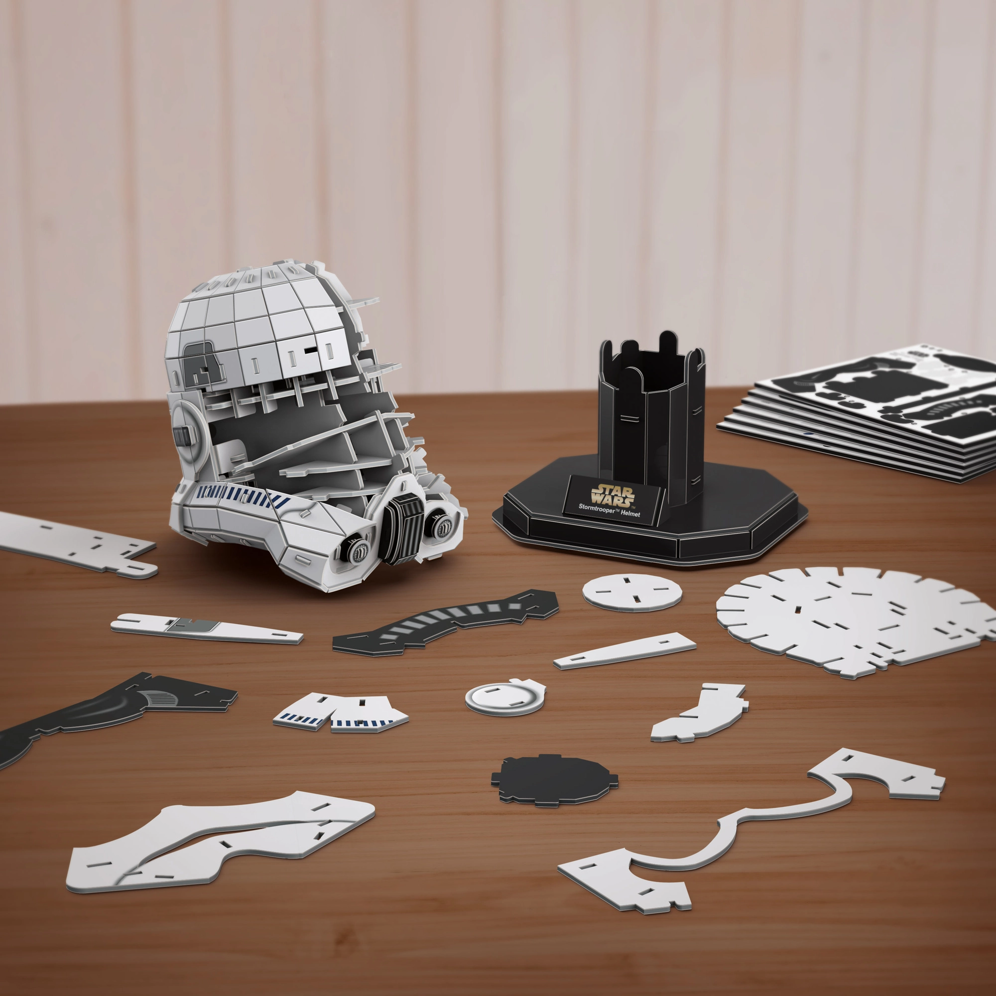 Ten precyzyjnie zaprojektowany model 3D hełmu szturmowca ucieszy każdego fana Star Wars. Zestaw zawiera 121 wstępnie wycinanych elementów na 6 kartach, które łatwo wyłamiesz i złożysz według przejrzystej instrukcji. Efektem jest kompaktowy model o wymiarach 12 × 12 × 16 cm ze stojakiem i tabliczką do efektownej ekspozycji.