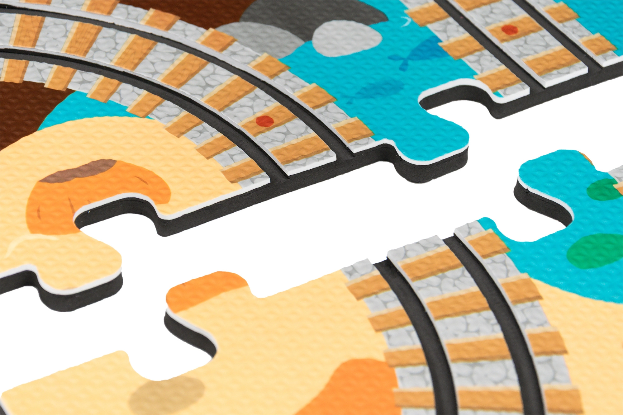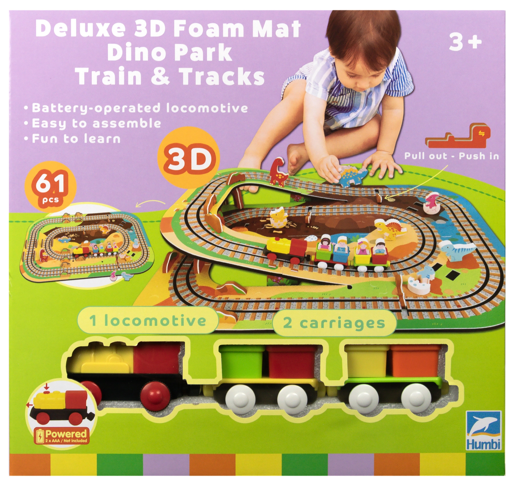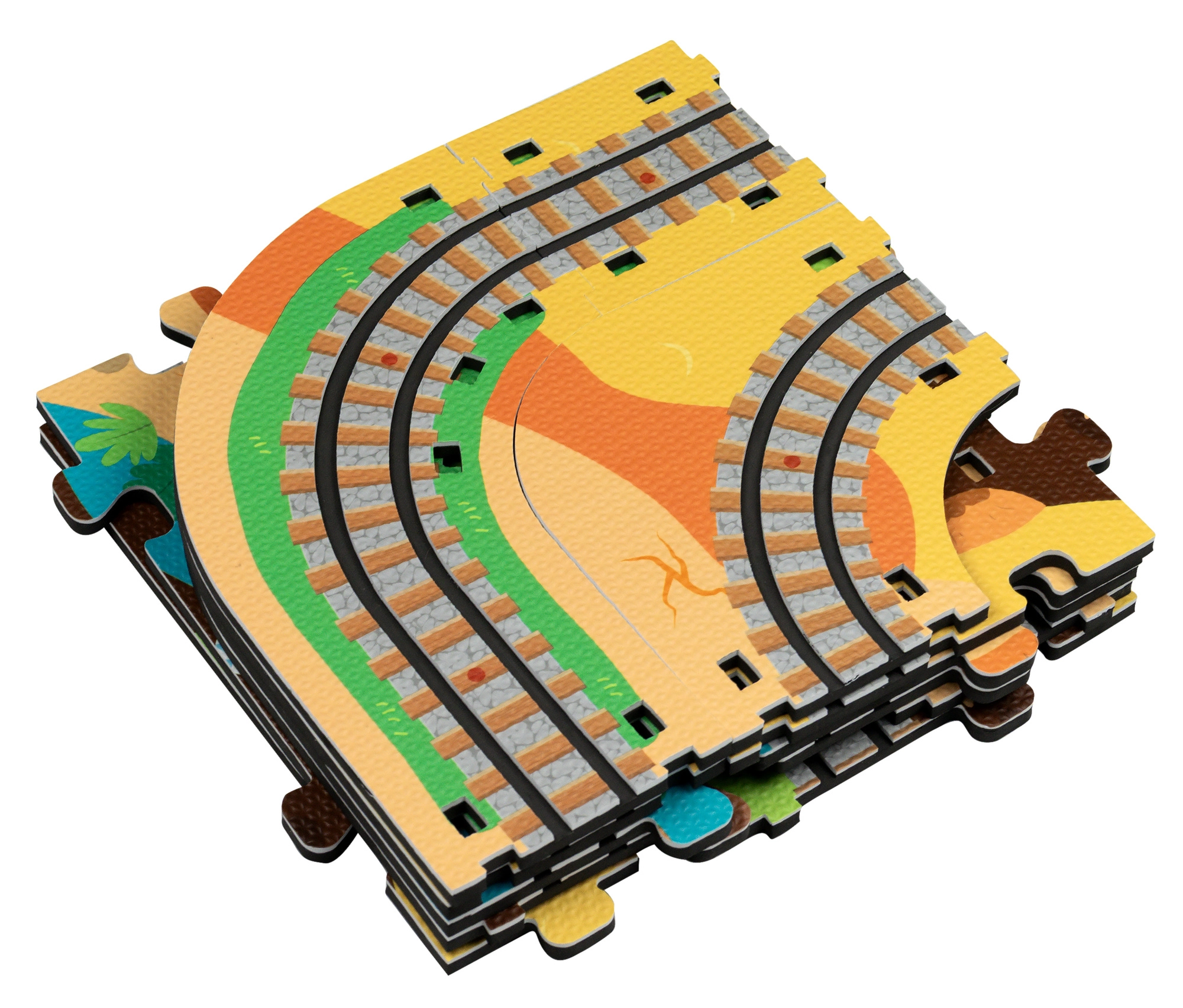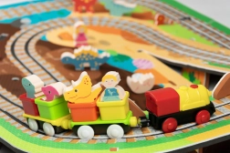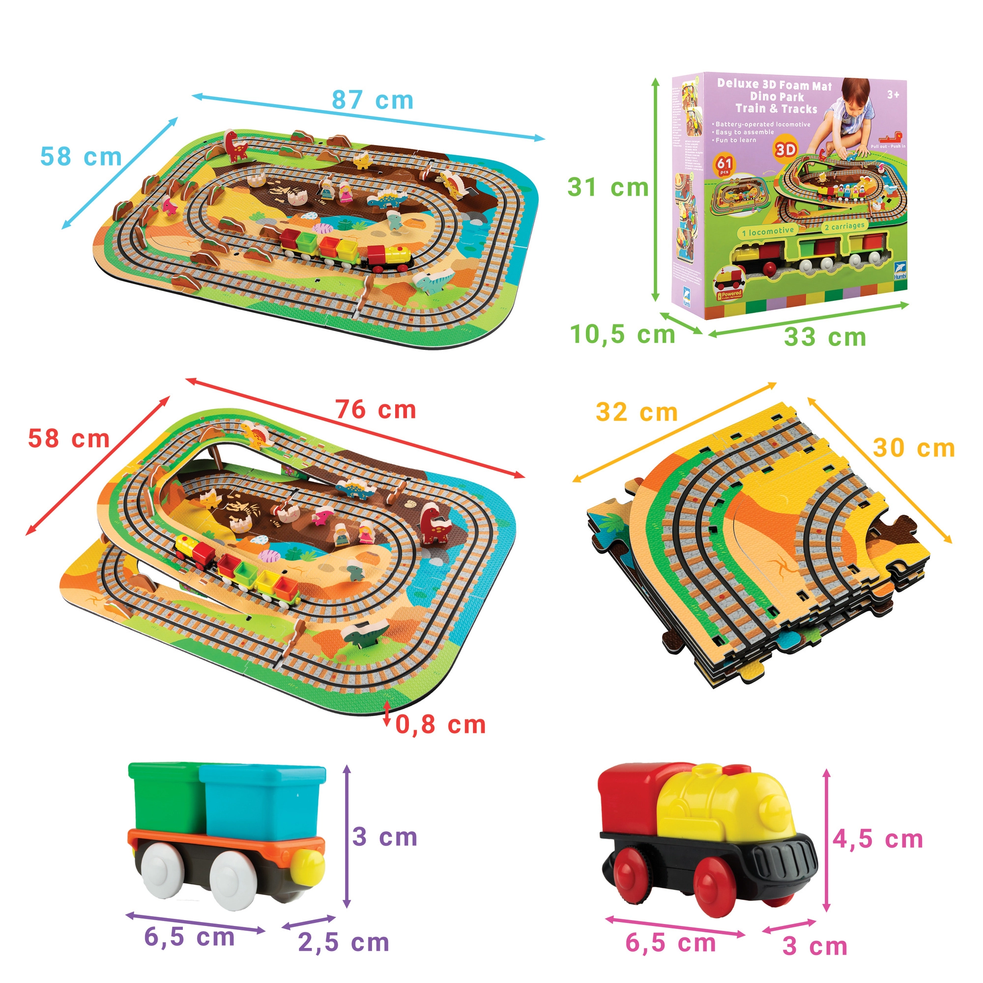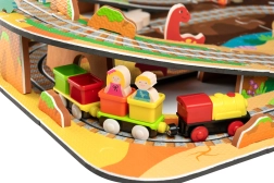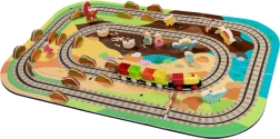 W zestawie znajduje się 12 sztuk torów, 42 tematyczne akcesoria oraz praktyczne pudełeczka do wagoników do przewozu pasażerów lub drobiazgów. Miękki, wytrzymały i bezzapachowy materiał EVA zapewnia komfortową i bezpieczną zabawę. Produkt spełnia normy EN 71, RoHS 2011/65/EU i posiada oznaczenie CE.