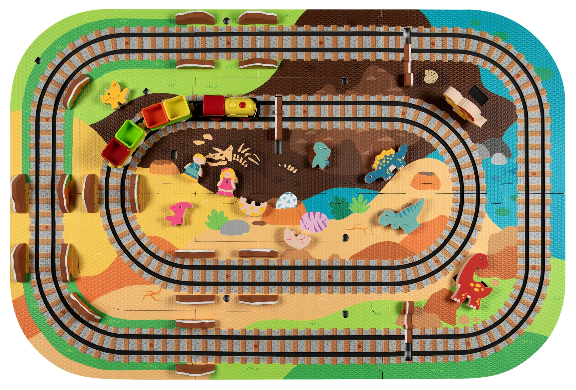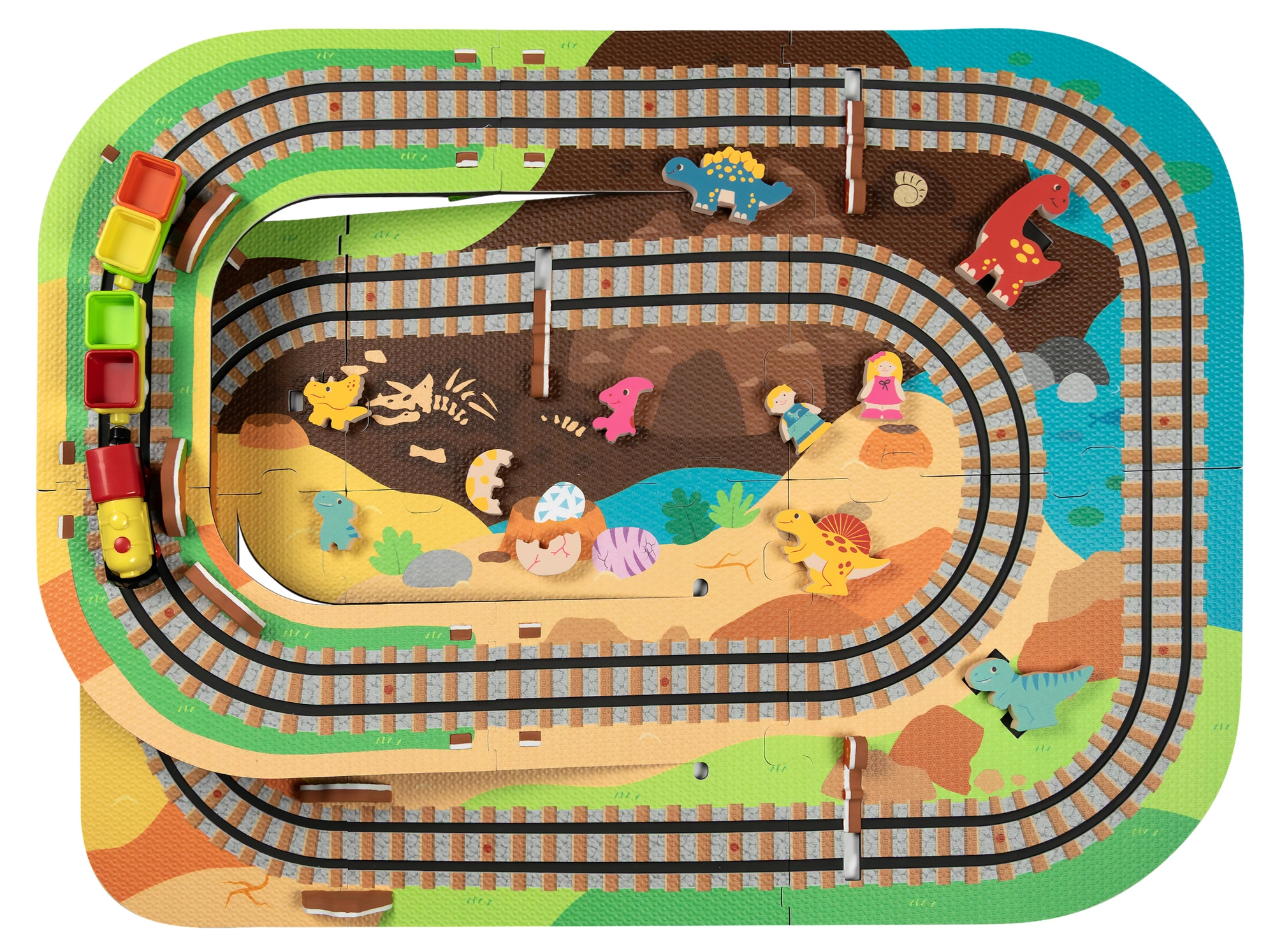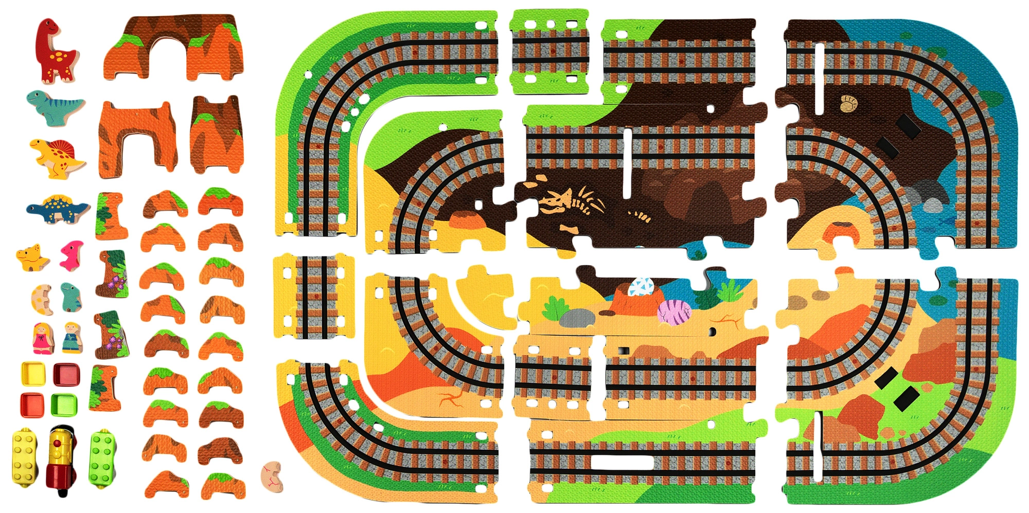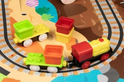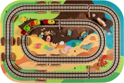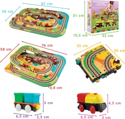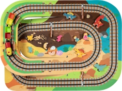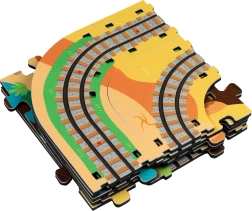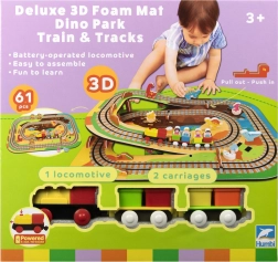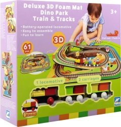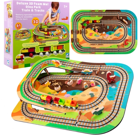 Ten kreatywny zestaw łączy piankowe puzzle z EVA z motywem dinozaurów oraz tor kolejowy dla pociągu. Elementy łatwo do siebie pasują i pozwalają zbudować płaskie odcinki i strome podjazdy. Lokomotywa z wagonikami (na baterie) porusza się po torze płynnie, a dzieci mogą wzbogacić zabawę o drewniane/piankowe figurki dinozaurów, skały i tunele.