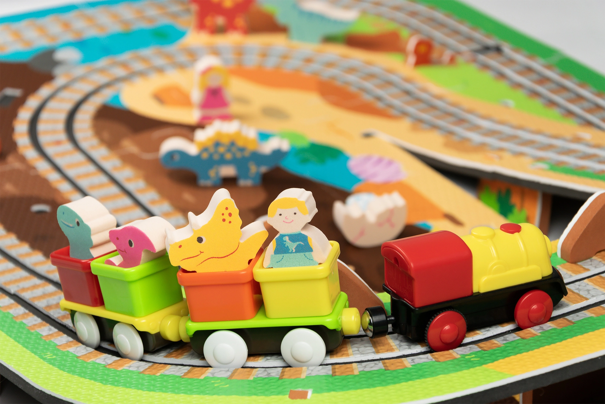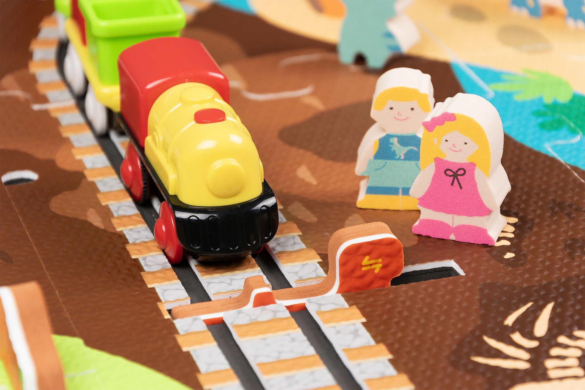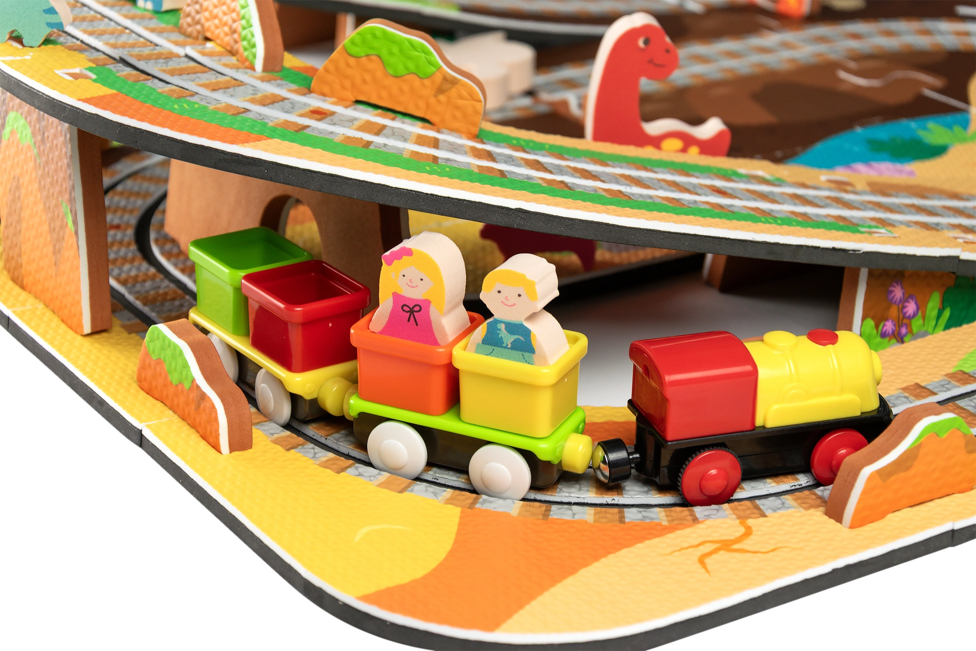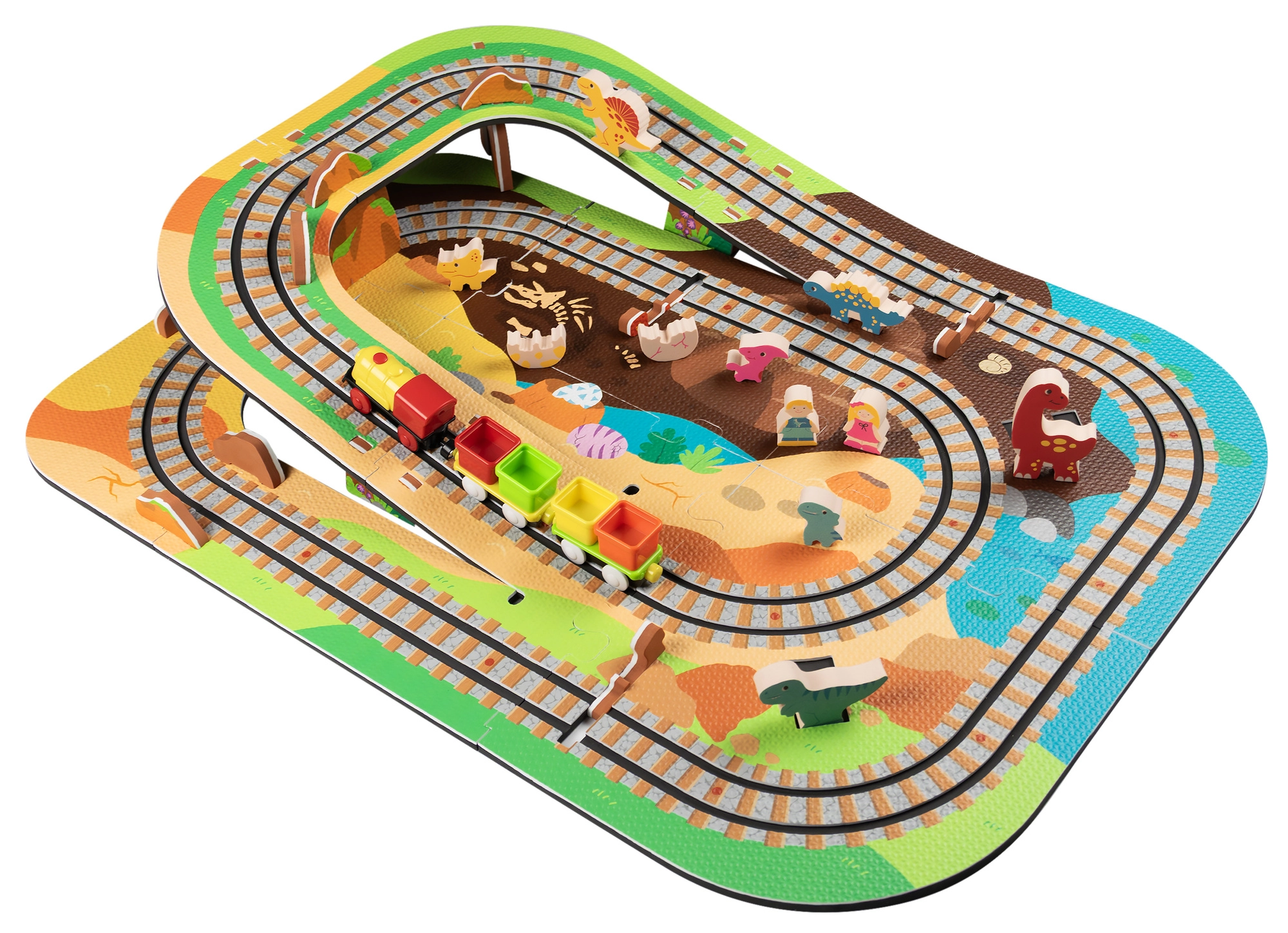 Ten kreatywny zestaw łączy piankowe puzzle z EVA z motywem dinozaurów oraz tor kolejowy dla pociągu. Elementy łatwo do siebie pasują i pozwalają zbudować płaskie odcinki i strome podjazdy. Lokomotywa z wagonikami (na baterie) porusza się po torze płynnie, a dzieci mogą wzbogacić zabawę o drewniane/piankowe figurki dinozaurów, skały i tunele.