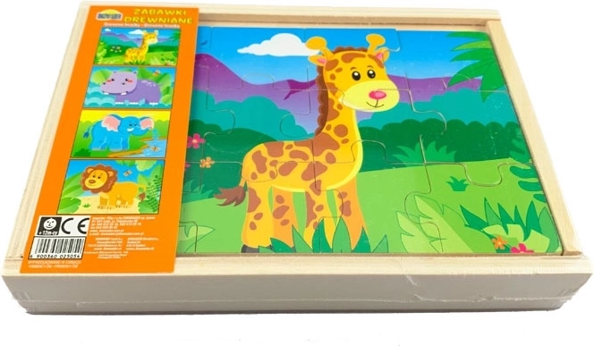 Urocze drewniane puzzle z czterema zwierzętami z ZOO ucieszą każde dziecko. Wspierają małą motorykę, logiczne myślenie oraz poznawanie świata zwierząt. Pogodne kolory i uśmiechnięte motywy przynoszą radość z zabawy i bezpieczną rozrywkę dla najmłodszych.