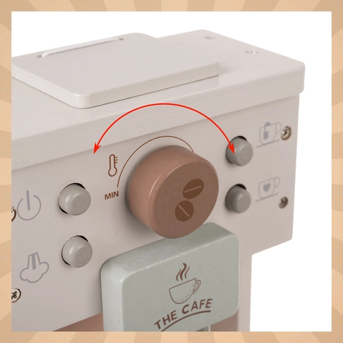 Stylowy drewniany ekspres do kawy dla dzieci KRUZZEL łączy zabawę z nauką. Wspiera kreatywność, motorykę małą oraz zabawy w odgrywanie ról dzięki realistycznym akcesoriom. Bezpieczne materiały i solidne wykonanie czynią z niego świetny prezent dla małych baristów od 3 lat.