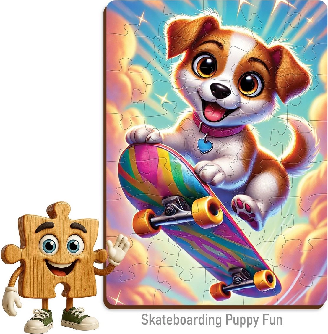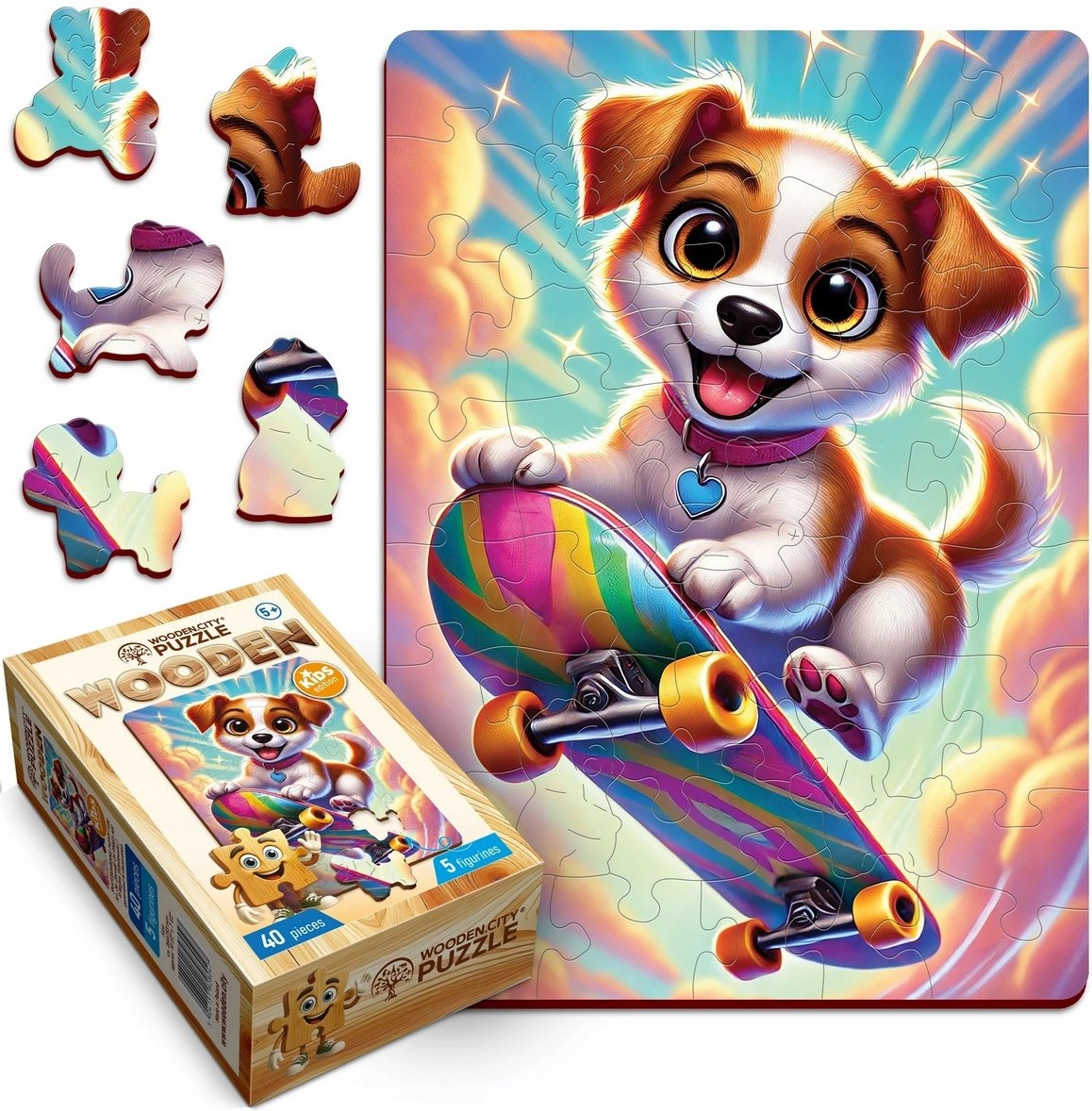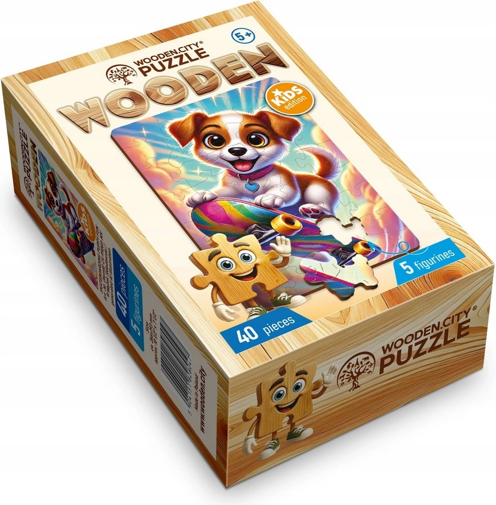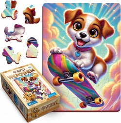 Zabawne drewniane puzzle z motywem uroczego pieska na deskorolce ucieszą młodsze i starsze dzieci. Zawierają 40 elementów, w tym 5 unikalnie kształtowanych, które wspierają koncentrację, cierpliwość i kreatywność. Dzięki precyzyjnej obróbce laserowej elementy mają gładkie krawędzie bez drzazg, a układanka tworzy urzekającą scenę.