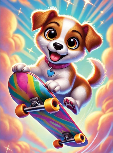 - Piękna ilustracyjna scena z pieskiem na deskorolce, która motywuje do ukończenia obrazka.