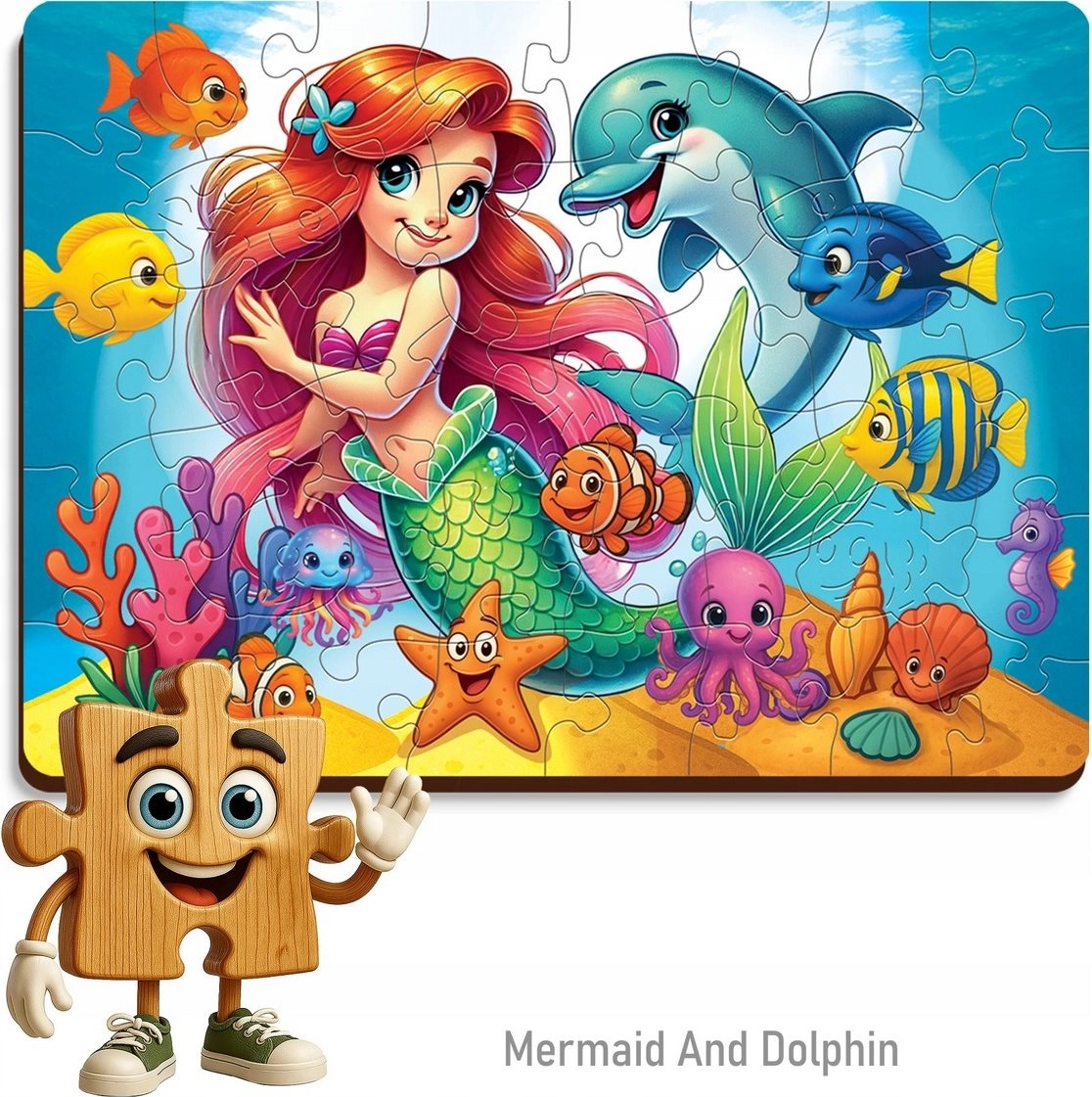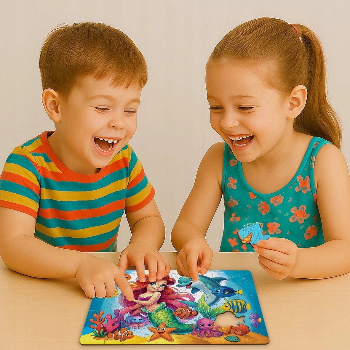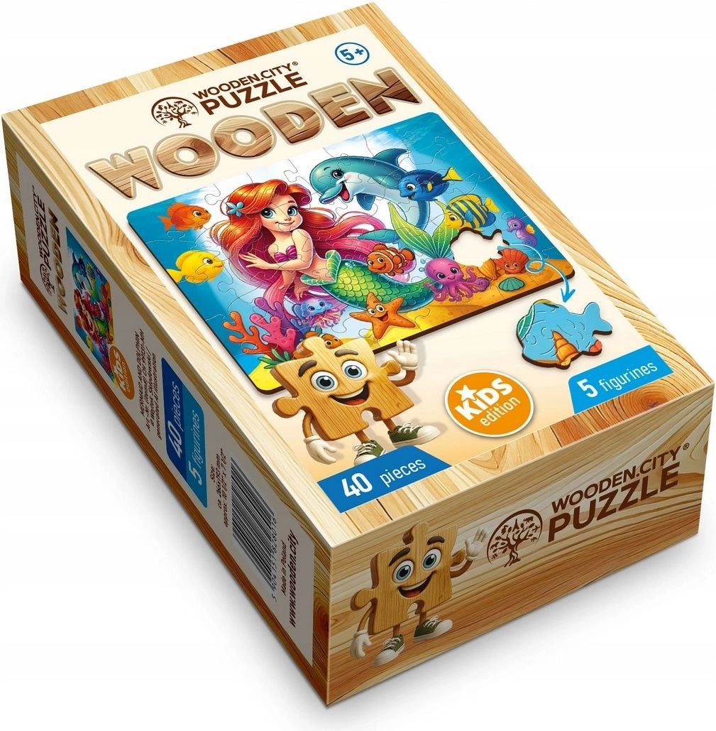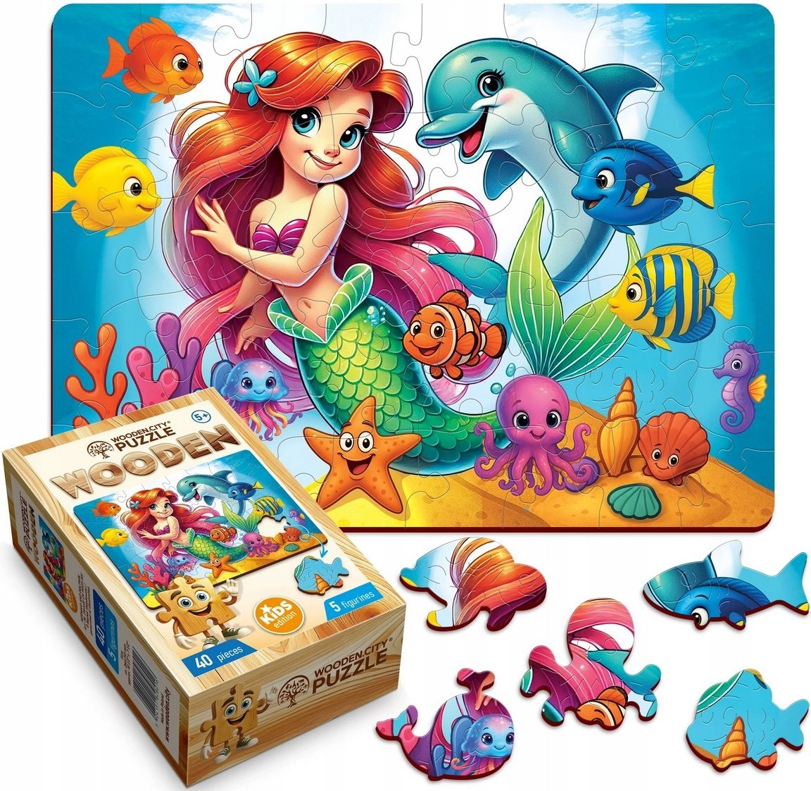 Drewniane puzzle WOODEN CITY z motywem syreny i delfina dostarczają dzieciom pięknych wrażeń wizualnych oraz radości z ukończonego obrazka. Dzięki wysokiej jakości wykonania elementy przyjemnie się układają i świetnie do siebie pasują. Ułożony obrazek ma wymiary około 26,6 × 19,3 cm, idealny do wielokrotnego układania i ekspozycji.