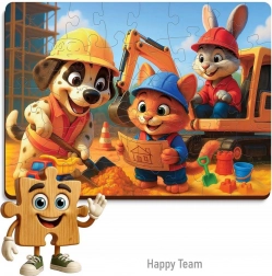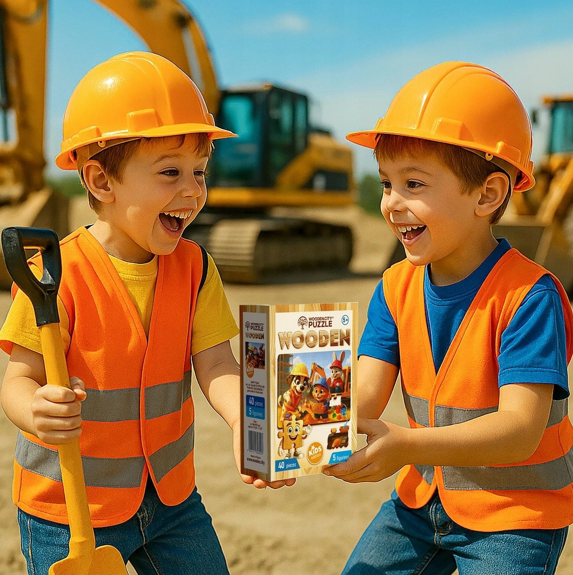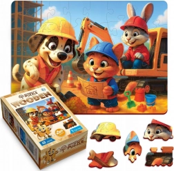 Drewniane puzzle WOODEN CITY Wesoły zespół dostarczają dzieciom świetnej zabawy z wysoką jakością wykonania i przyjemnym, drewnianym materiałem. Dzięki 40 solidnym elementom i 5 specjalnym kształtom dzieci trenują motorykę małą i myślenie logiczne, a przy tym cieszą się kolorową sceną z uroczymi zwierzęcymi budowniczymi.