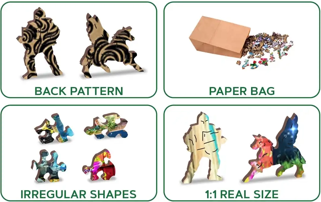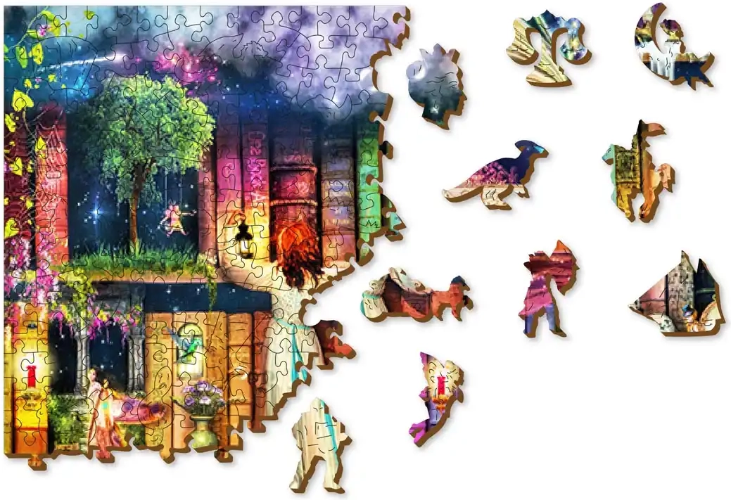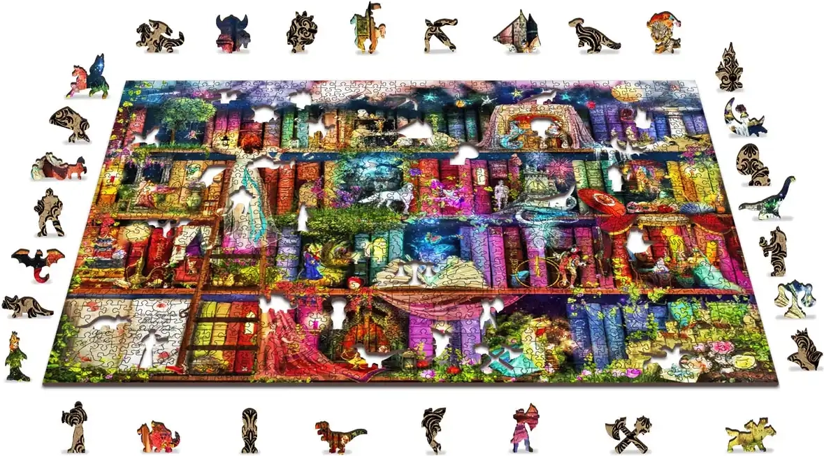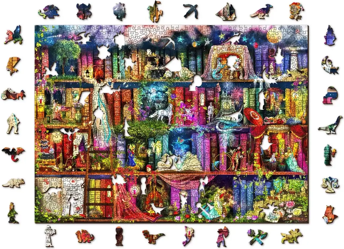 Zanurz się w świecie fantazji z drewnianymi puzzlami WOODEN CITY – Biblioteka skarbów. Żywe kolory, oryginalna ilustracja i staranne wykonanie gwarantują przyjemne układanie oraz piękny końcowy obraz o wymiarach ok. 51,9 × 37,5 cm. Dzięki wyjątkowym kształtom elementów każde układanie staje się ciekawym wyzwaniem.