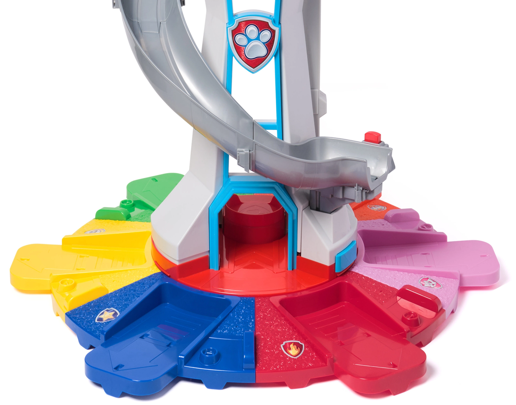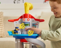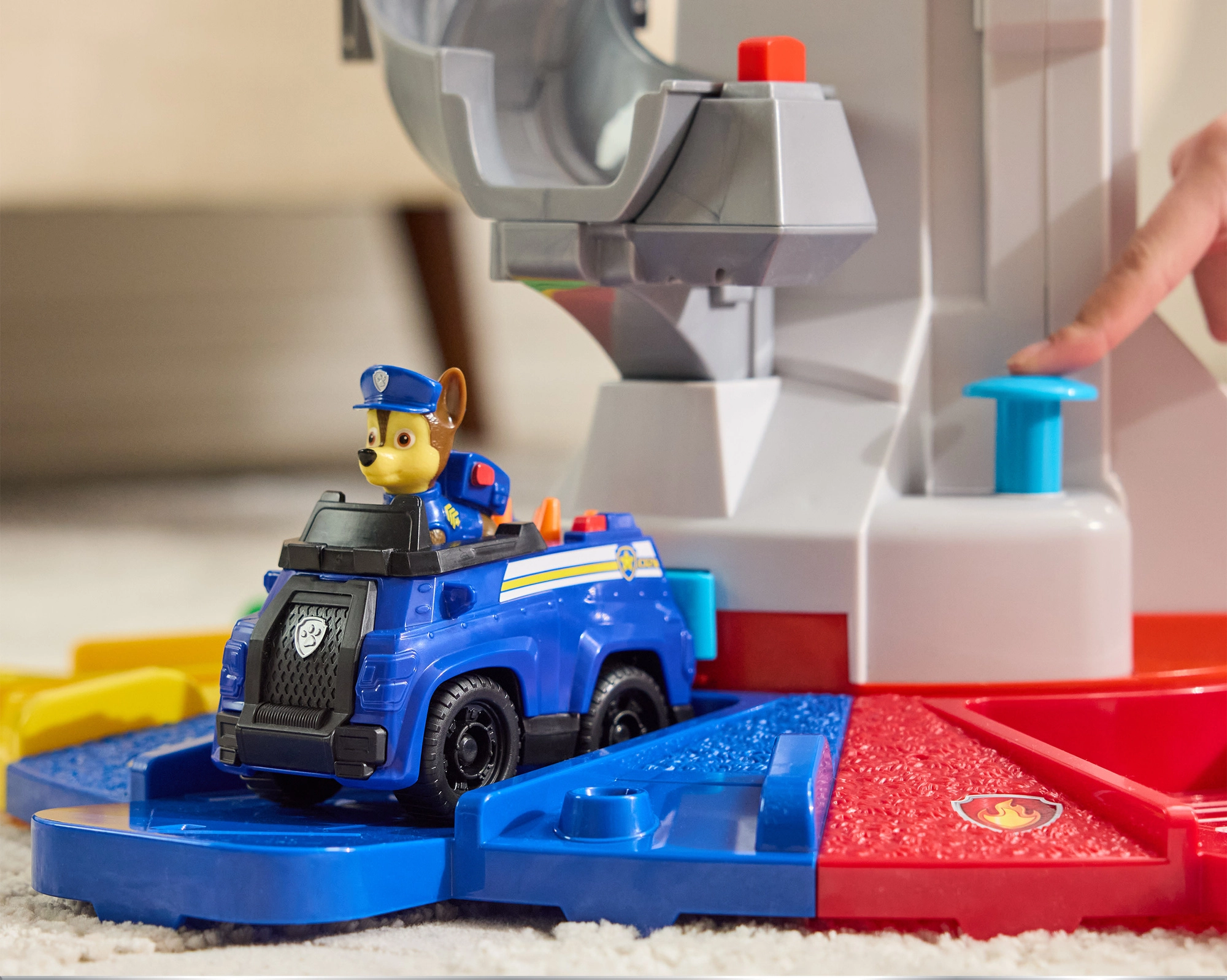 Ikoniczna baza z PAW PATROL oferuje dzieciom nieskończone możliwości zabawy. Po wybraniu misji z panelu z przyciskami i efektami wystarczy wjechać Chase’em windą na górę, rozejrzeć się obrotowym peryskopem i rozpocząć bohaterską akcję ratunkową po szerokiej zjeżdżalni prosto na obrotową rampę wyrzutni.