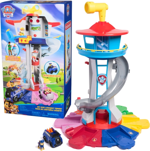 Przeżyj akcję jak w filmie z ponad 81‑centymetrową wieżą My Size Lookout Tower z PAW PATROL. Dzieci zachwycą efekty świetlne i dźwiękowe, winda, obrotowy peryskop oraz długa zjeżdżalnia do wyrzutni. W zestawie znajduje się figurka Chase’a i jego policyjny pojazd – gotowe do zabawy zaraz po rozpakowaniu.