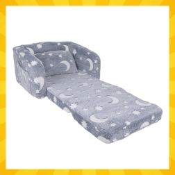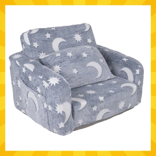 Miękki komfort i zabawa w jednym – rozkładany fotelik dziecięcy Kruzzel łatwo zmienia się w leżankę do czytania, odpoczynku i bajek. Leciutki, bezpieczny i łatwy do przenoszenia, z praktyczną boczną kieszenią oraz miękkim pluszowym pokryciem. Fluorescencyjne księżyce i gwiazdki delikatnie świecą w ciemności, tworząc kojącą atmosferę do spokojnego zasypiania.