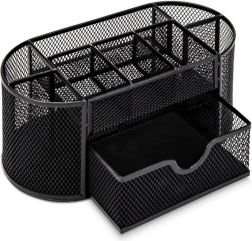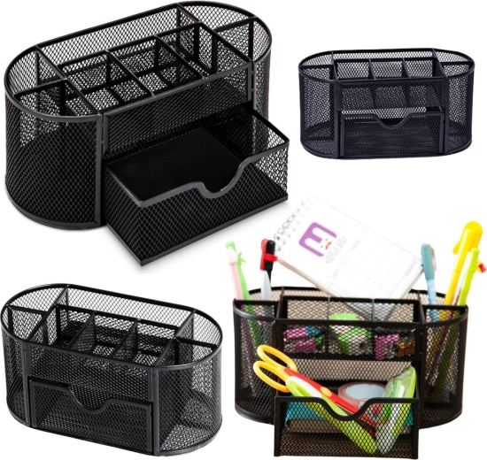 Praktyczny podział oferuje 6 przegródek, w tym małą wysuwaną szufladkę na drobiazgi. Organizer jest stabilny, trwały i gotowy na codzienne obciążenia. Dzięki kompaktowym wymiarom oszczędza miejsce, a jednocześnie zapewnia wystarczająco dużo przestrzeni na przybory do pisania, notatniki, spinacze i inne niezbędniki.